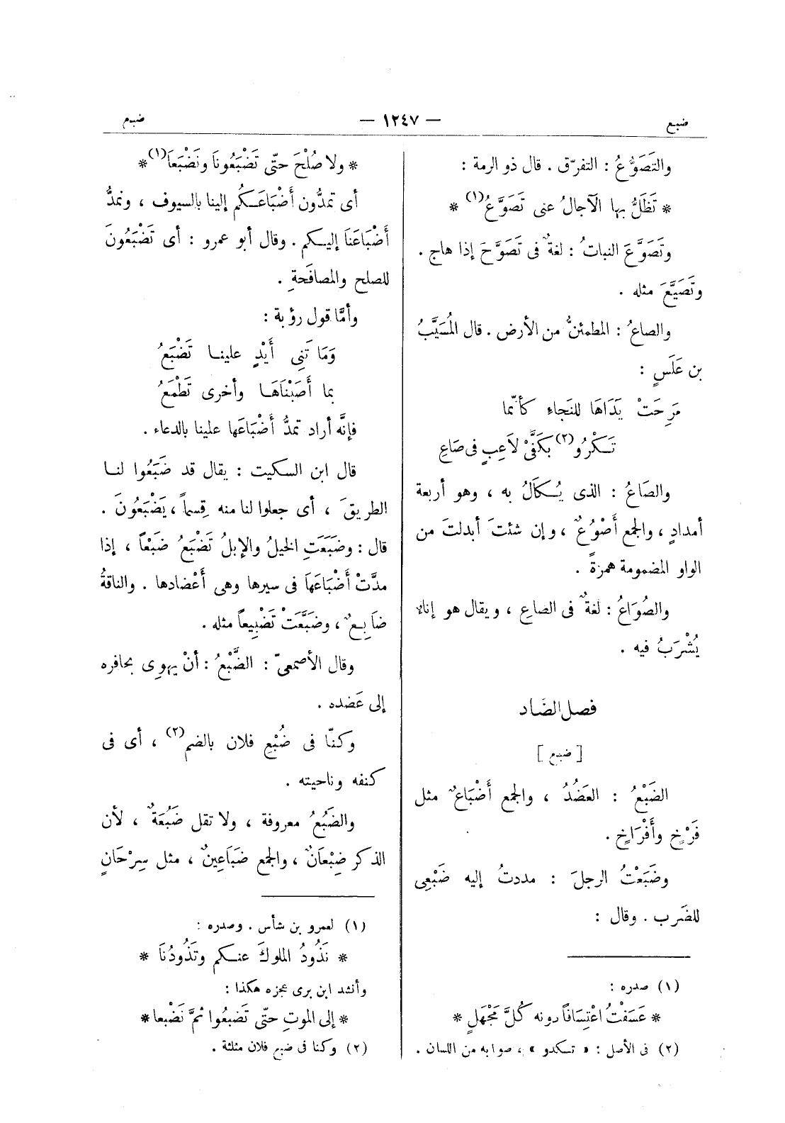 تَظَلُّ بها الآجالُ عني تَصَوَّعُ (¬1) * وتَصَوَّعُ النباتُ: لغةٌ في تَصَوَّحَ إذا هاج. وتصيع مثله. والصاع: المطمئن من الأرض. قال المُسَيَّبُ بن عَلَسٍ: مَرِحَتْ يَداها للنَجاءِ كأنّما * تَكرو (¬2) بكَفَّيْ لاعِبٍ في صاعِ * والصاعُ: الذي يُكالُ به، وهو أربعة أمدادٍ، والجمع أَصْوُعٌ، وإن شئتَ أبدلتَ من الواو المضمومة همزةً. والصُواعُ ": لغةٌ في الصاعِ، ويقال هو إناء يشرب فيه.
