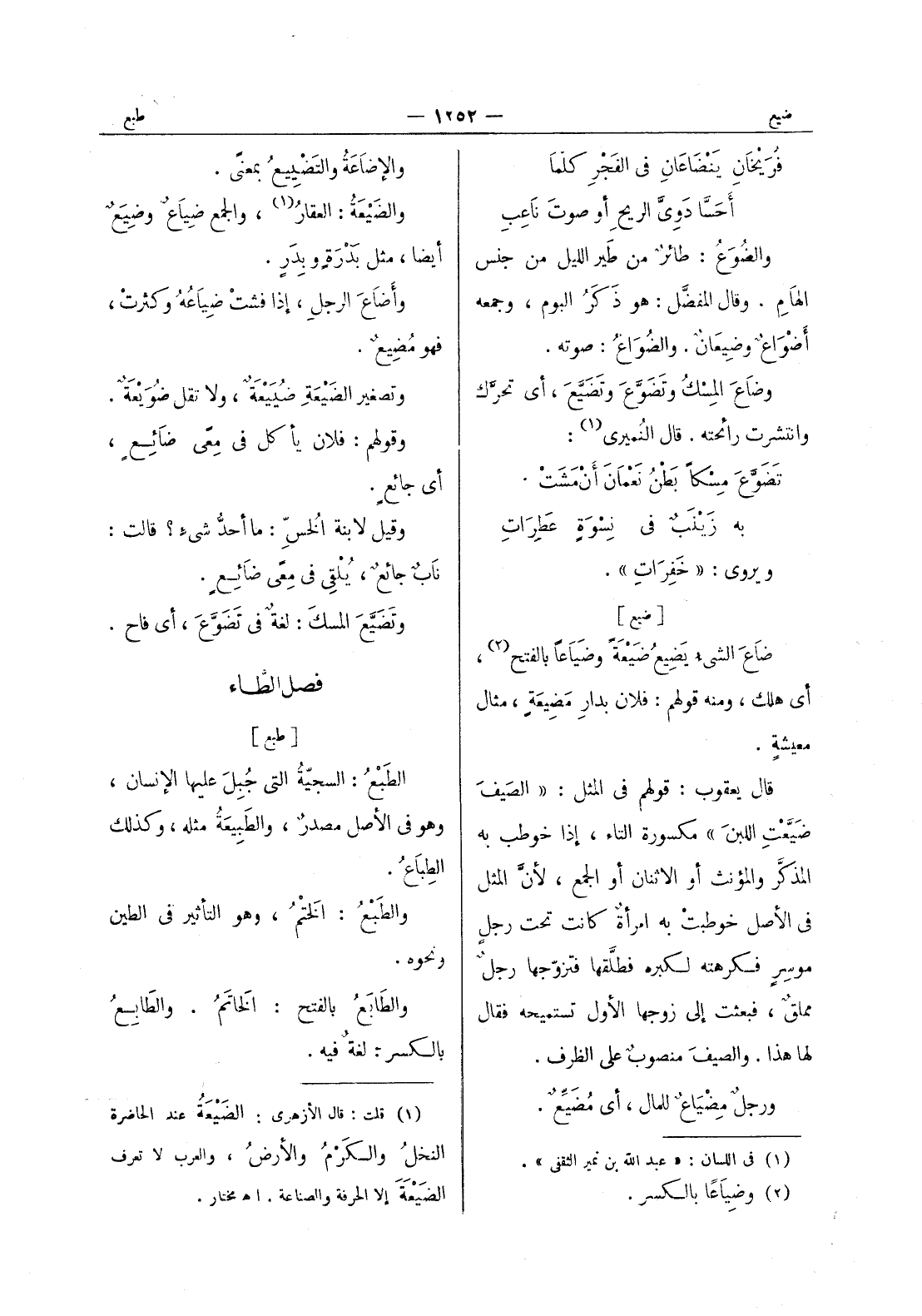 فريخان ينضاعان في الفجر كلَّما * أَحَسَّا دَوِيَّ الريحِ أو صوتَ ناعِبِ * والضُوَعُ: طائرٌ من طير الليل من جنس الهامِ. وقال المفضَّل: هو ذَكَرُ البوم، وجمعه أضْواعٌ وضيعانٌ. والضواعُ: صوته. وضاعَ المِسْكُ وتَضَوَّعَ وتَضَيَّعَ، أي تحرَّك وانتشرت رائحته. قال النُميري (¬1) : تَضَوَّعَ مِسْكاً بَطْنُ نَعْمانَ أنْ مَشَتْ * به زَيْنَبٌ في نِسْوَةٍ عطرات * ويروى: " خفرات ".
