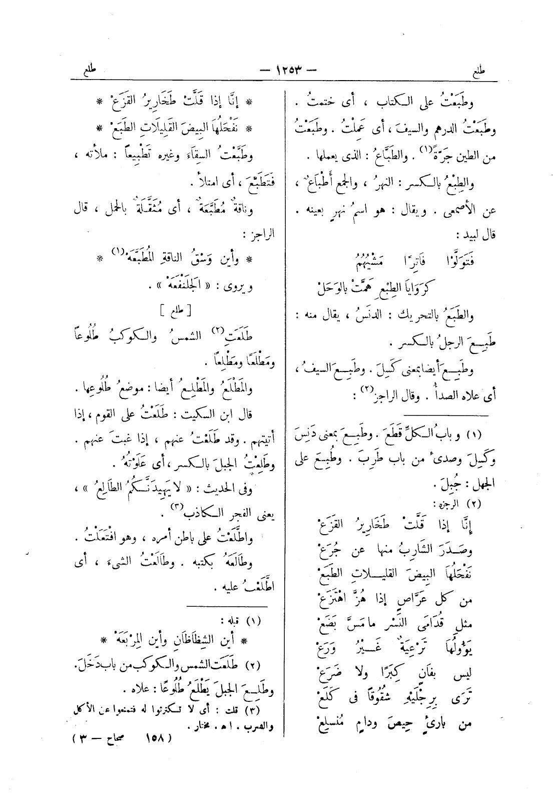 [طلع] طَلَعَتِ (¬2) الشمسُ والكوكبُ طُلوعاً ومَطْلِعاً ومطلعاً. والمَطْلَعُ والمَطْلِعُ أيضاً: موضعُ طلوعها. قال ابن السكيت: طَلَعْتُ على القوم، إذا أتيتهم. وقد طَلَعتُ عنهم، إذا غبتَ عنهم. وطَلِعْتُ الجبل بالكسر، أي علوته. وفى الحديث: " لا يهيدنكم الطالِعُ "، يعني الفجر الكاذب (¬3) . واطَّلعتُ على باطن أمره، وهو افْتَعَلْتُ. وطالعه بكتبه. وطالعت الشئ، أي اطلعت عليه.