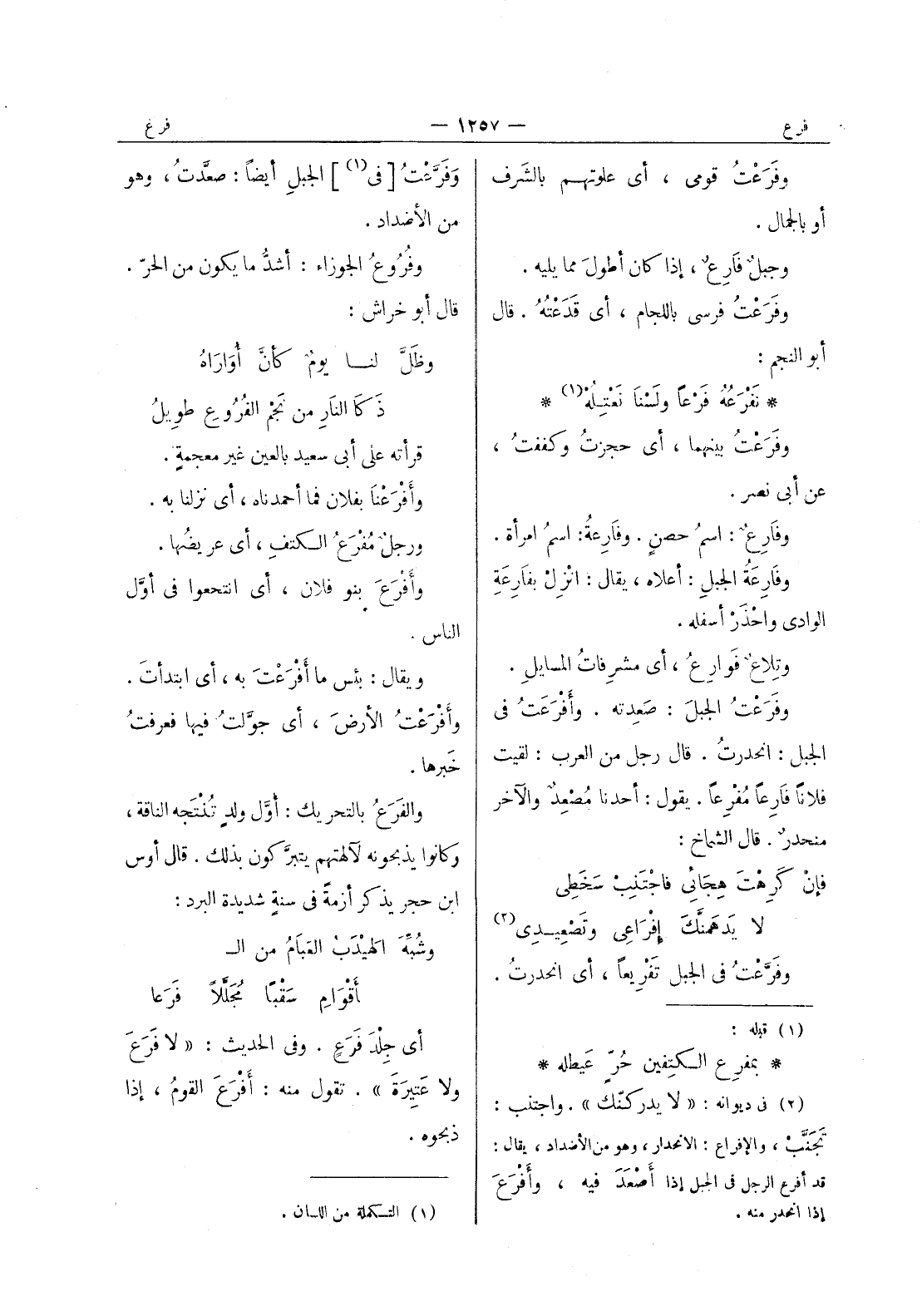 نفرعه فرعا ولسنا نعتله (¬1) * وفرعت بينهما، أي حجزت وكففت، عن أبى نصر. وفارع: اسم حصن. وفارعة: اسم امرأة. وفارعة الجبل: أعلاه، يقال: انْزل بفارِعَةِ الوادي واحْذَر أسفله. وتِلاعٌ فَوارِعُ، أي مشرفاتُ المسايل. وفَرَعْتُ الجبلَ: صعدته. وأفْرَعْتُ في الجبل: انحدرت. قال رجل من العرب: لقيت فلانا فارعا مفرعا. يقول: أحدنا مصعد والآخر منحدر. قال الشمّاخ: فإنْ كَرِهْتَ هِجائي فاجْتَنبِ سَخَطي * لا يدْهَمَنَّكَ إفْراعي وتَصْعيدي (¬2) * وفرعت في الجبل تفريعا، أي انحدرت.