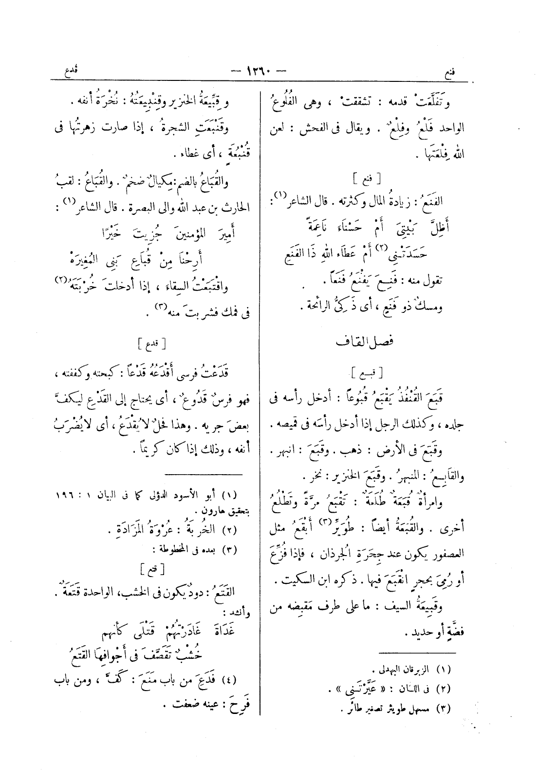 وقبيعة الخنزير وقنبيعته: نخرة أنفه. وقَنْبَعَتِ الشجرةُ، إذا صارت زهرتها في قُنْبَعَةٍ، أي غطاء. والقباع بالضم: مكيال ضخم. والقباع: لقب الحارث بن عبد الله والى البصرة. قال الشاعر (¬1) : أمير المؤمنين جزيت خيرا * أرحنا من قباع بنى المغيره * واقتبعت السِقاءَ، إذا أدخلت خُرْبَتَهُ (¬2) في فمك فشربت منه (¬3) .