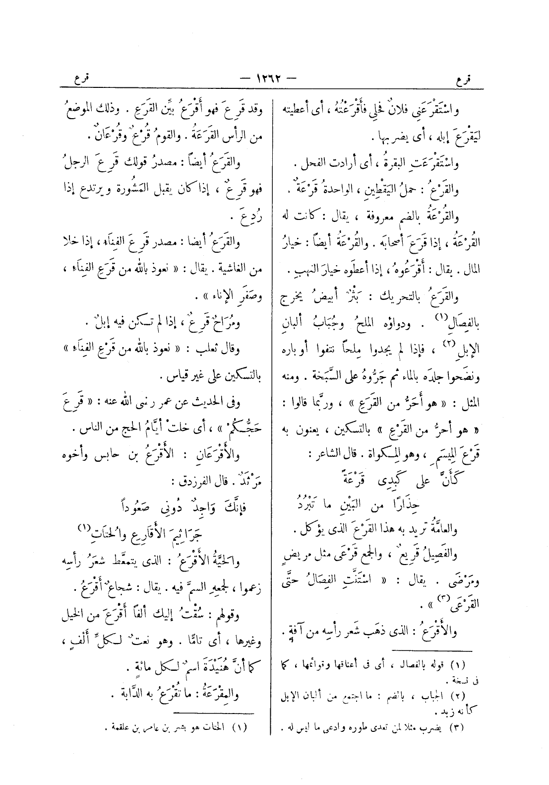 واستقرعنى فلان فحلى فأقرعته، أي أعطيته ليقرَعَ إبله، أي يضربها. واسْتَقْرَعَتِ البقرةُ، أي أرادت الفحل. والقَرْعُ: حملُ اليقطين، الواحدة قَرْعَةٌ. والقُرعَةُ بالضم معروفةٌ، يقال: كانت له القُرْعةُ، إذا قَرَعَ أصحابه. والقُرعَةُ أيضاً: خيارُ المال. يقال: أقْرَعوهُ، إذا أعطوه خيارَ النهبِ. والقَرَعُ بالتحريك: بَثْرٌ أبيضُ يخرج بالفصال (¬1) . ودواؤه الملح وجباب ألبان الابل (¬2) ، فإذا لم يجدوا ملحا نتفوا أوباره ونضحوا جلده بالماء ثم جروه على السبخة. ومنه المثل: " هو أحر من القرع "، وربما قالوا: " هو أحر من القرع " بالتسكين، يعنون به قرع الميسم، وهو المكواة. قال الشاعر: كأن على كبدي قرعة * حذارا من البين ما تبرد * والعامة تريد به هذا القرع الذى يؤكل. والفصيل قريع، والجمع قرعى مثل مريض ومرضى. يقال: " استنت الفصال حتى القَرْعى (¬3) ". والأقْرَعُ: الذي ذهب شعر رأسه من آفة.