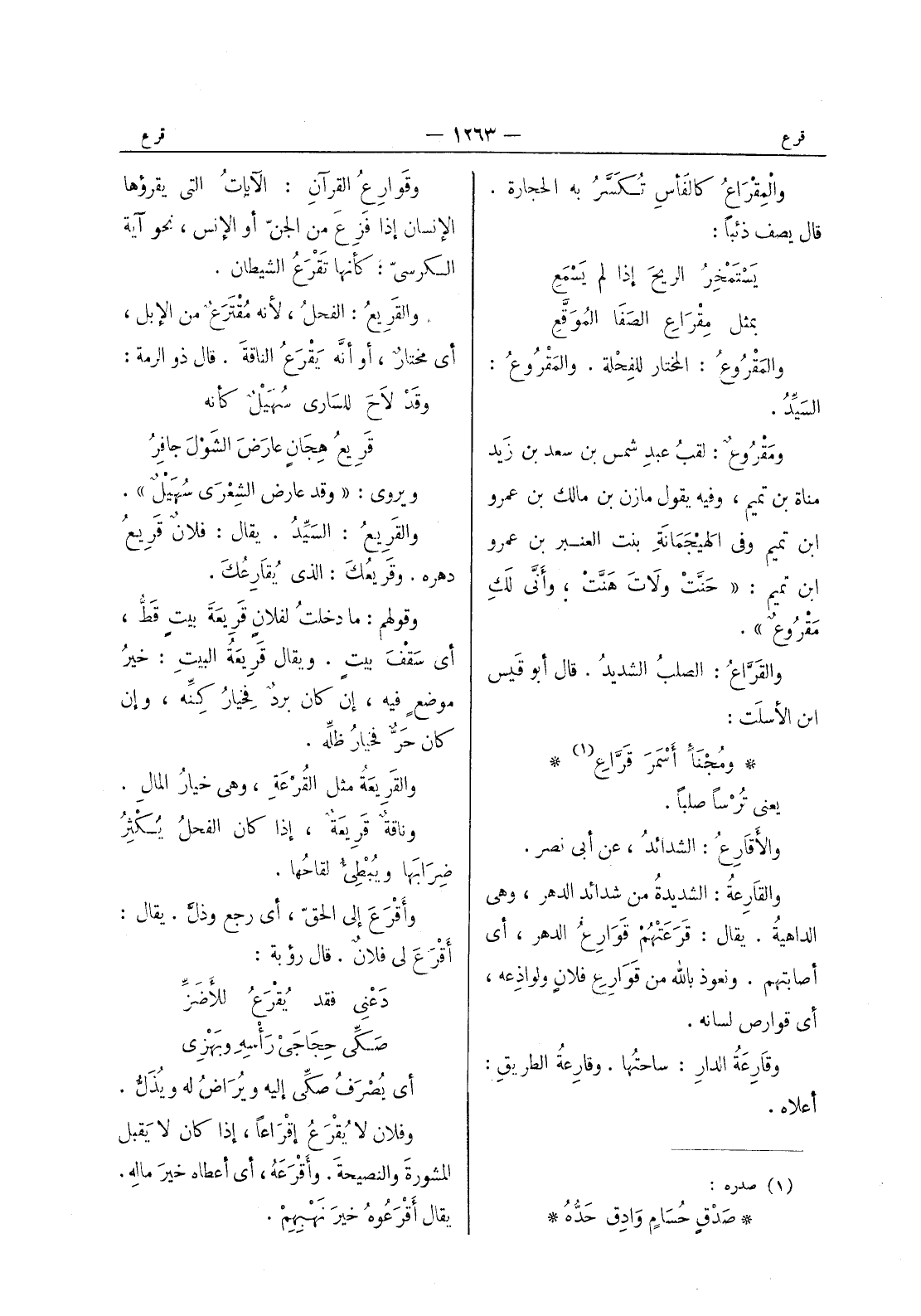 وقوارع القرآن: الآيات التى يقرؤها الإنسان إذا فزع من الجنّ أو الإنس، نحو آية الكرسي ; كأنَّها تَقْرَعُ الشيطان. والقَريعُ: الفحلُ، لأنه مُقْتَرَعٌ من الإبل، أي مختارٌ، أو أنَّه يقرَعُ الناقة. قال ذو الرمة: وقد لاح للساري سهيل كأنَّه * قريعُ هِجانٍ عارضَ الشَوْلَ جافر * ويروى: " وقد عارض الشعرى سهيل ". والقريع: السيد. يقال: فلان قَريعُ دهره. وقَريعُكَ: الذي يُقارِعُكَ. وقولهم: ما دخلتُ لفلان قَريعَةَ بيتٍ قطُّ، أي سقف بيتٍ. ويقال قريعَةُ البيتِ: خيرُ موضعٍ فيه، إن كان بردٌ فخِيارُ كِنِّه، وإن كان حَرٌّ فخيارُ ظلِّه. والقَريعَةُ مثل القُرْعَةِ، وهي خيار المال. وناقة قَريعَةٌ، إذا كان الفحل يُكثر ضِرابها ويبطئ لقاحها. وأقْرَعَ إلى الحقّ، أي رجع وذلّ. يقال: أقرع لى فلان. قال رؤبة: دعني فقد يقرع للاضز * صكى حجاجى رأسه وبهزى * أي يصرف صكى إليه ويراض له ويذل. وفلان لا يَقْرَعُ إقْراعاً، إذا كان لا يقبل المشورة والنصيحة. وأقْرَعَهُ، أي أعطاه خير ماله. يقال أقْرَعوه خير نهبهم.
