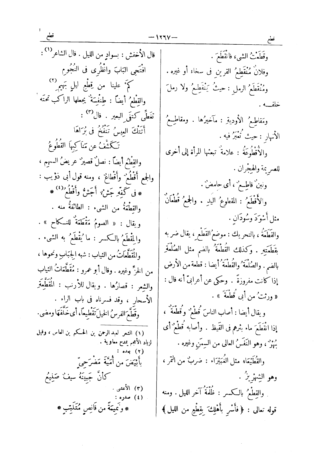 قال الاخفش: بسواد من الليل. قال الشاعر (¬1) : افتحي الباب وانظرى في النجوم * كم علينا من قطع ليل بهيم (¬2) * والقطع أيضا: طنفسة يجعلها الراكب تحتَه تغَطِّي كتفي البعير. قال (¬3) : أتتك العيس تنفخ في براها * تكشف عن مناكبها القطوع * والقطع أيضا: نصل قصير عريضُ السهم، والجمع أقْطعٌ وأقْطاعٌ، ومنه قول أبى ذؤيب: