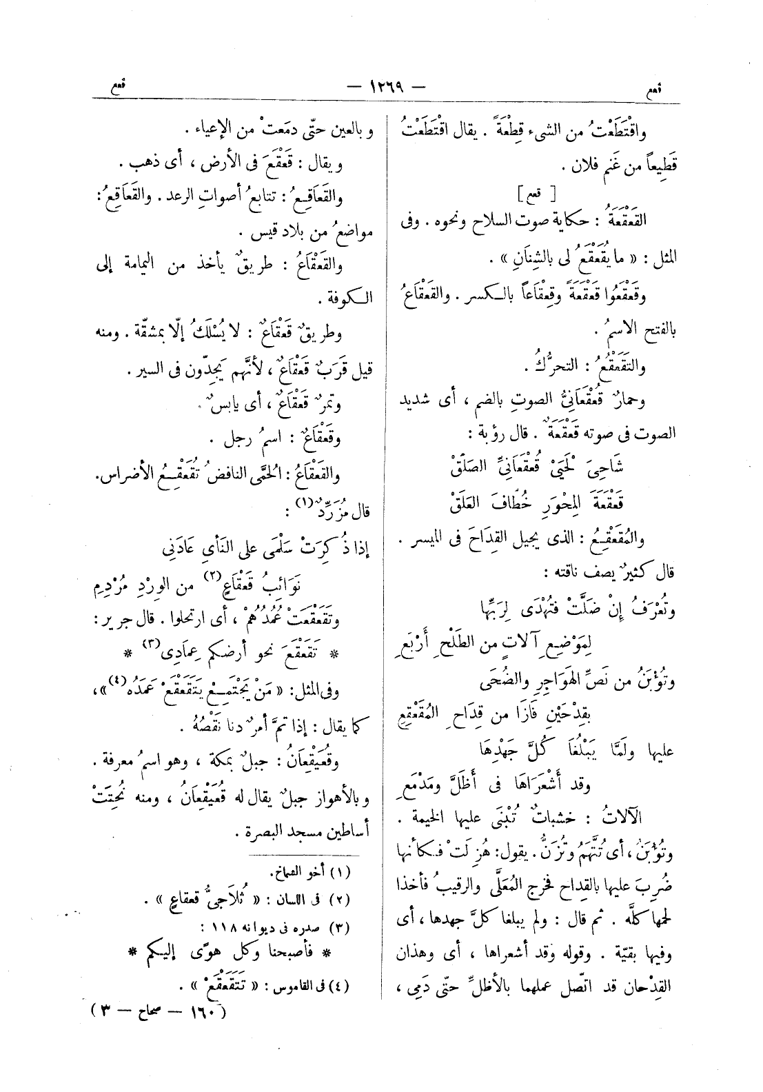 تَقَعْقَعَ نحو أرضكم عِمادي (¬3) * وفي المثل: " من يَجْتَمِعْ يَتَقَعْقَعْ عَمَدُه (¬4) "، كما يقال: إذا تم أمر دنا نقصه. وقعيقعان: جبل بمكة، وهو اسم معرفة. وبالاهواز جبل يقال له قعيقعان، ومنه نحتت أساطين مسجد البصرة.