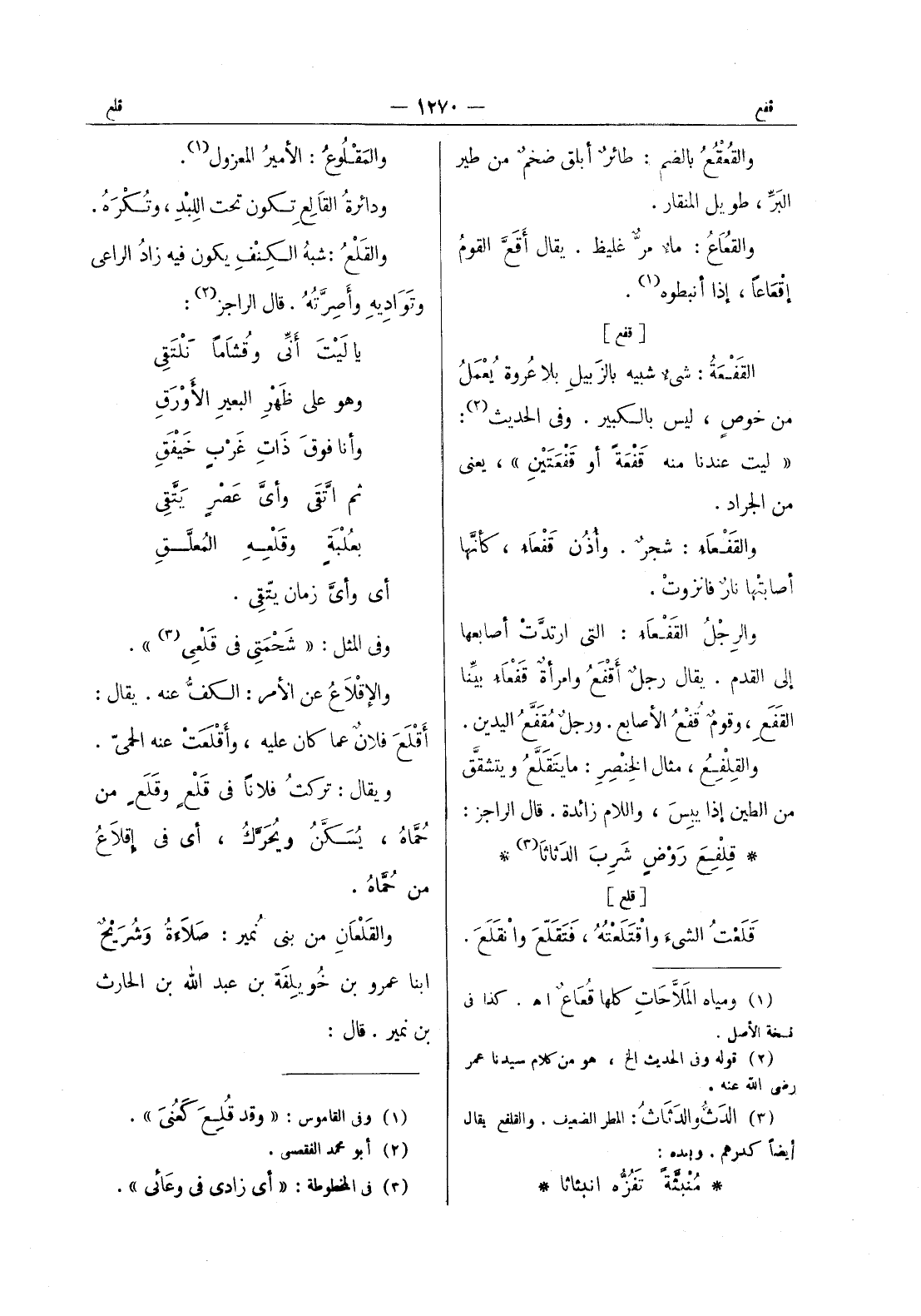 والمقلوع: الامير المعزول (¬1) . ودائرة القالِعِ تكون تحت اللِبْدِ، وتُكْرَهُ. والقَلْعُ: شبهُ الكِنْفِ يكون فيه زاد الراعى وتواديه وأصرته. قال الراجز (¬2) : يا ليت أنى وقشاما نلتقي * وهو على ظهر البعير الاورق * وأنا فوق ذات غرب خيفق * ثم اتقى وأى عصر يتقى * بعلبة وقلعه المعلق * أي وأى زمان يتقى. وفى المثل: " شحمتي في قلعي (¬3) ". والاقلاع عن الأمر: الكفُّ عنه. يقال: أقْلَعَ فلانٌ عما كان عليه، وأقْلَعَتْ عنه الحمّى. ويقال: تركت فلانا في قلع وقلع من حماه، يسكن ويحرك، أي في إقلاع من حماه. والقلعان من بنى نمير: صلاءة وشريح ابنا عمرو بن خويلفة بن عبد الله بن الحارث بن نمير. قال