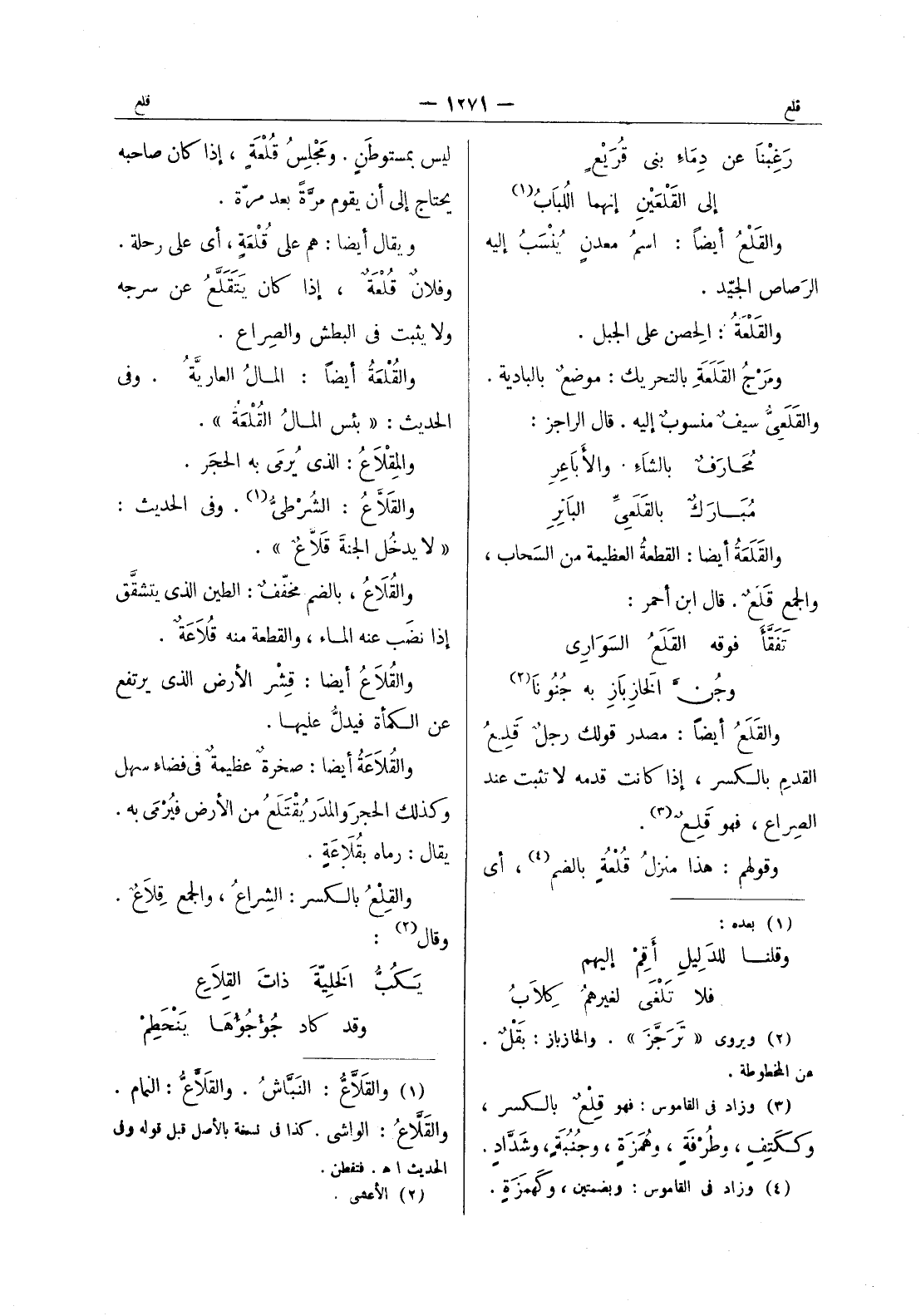 رغبنا عن دماء بنى قريع * إلى القلعين إنهما اللباب (¬1) * والقلع أيضا: اسم معدنٍ يُنْسب إليه الرَصاص الجيد. والقلعة: الحصن على الجبل. ومرج القلعة بالتحريك: موضع بالبادية. والقلعى سيف منسوب إليه. قال الراجز: محارف بالشاء والاباعر * مبارك بالقلعى البائر * والقلعة أيضاً: القطعةُ العظيمة من السحاب، والجمع قلع. قال ابن أحمر: تَفَقَّأَ فوقه القَلَعُ السَواري * وجُنَّ الخازباز به جنونا (¬2) * والقلع أيضا: مصدر قولك رجلٌ قلِعَ القدمِ بالكسر، إذا كانت قدمه لا تثبت عند الصِراع، فهو قَلِعٌ (¬3) . وقولهم: هذا منزلُ قُلْعَةٍ بالضم (¬4) ، أي