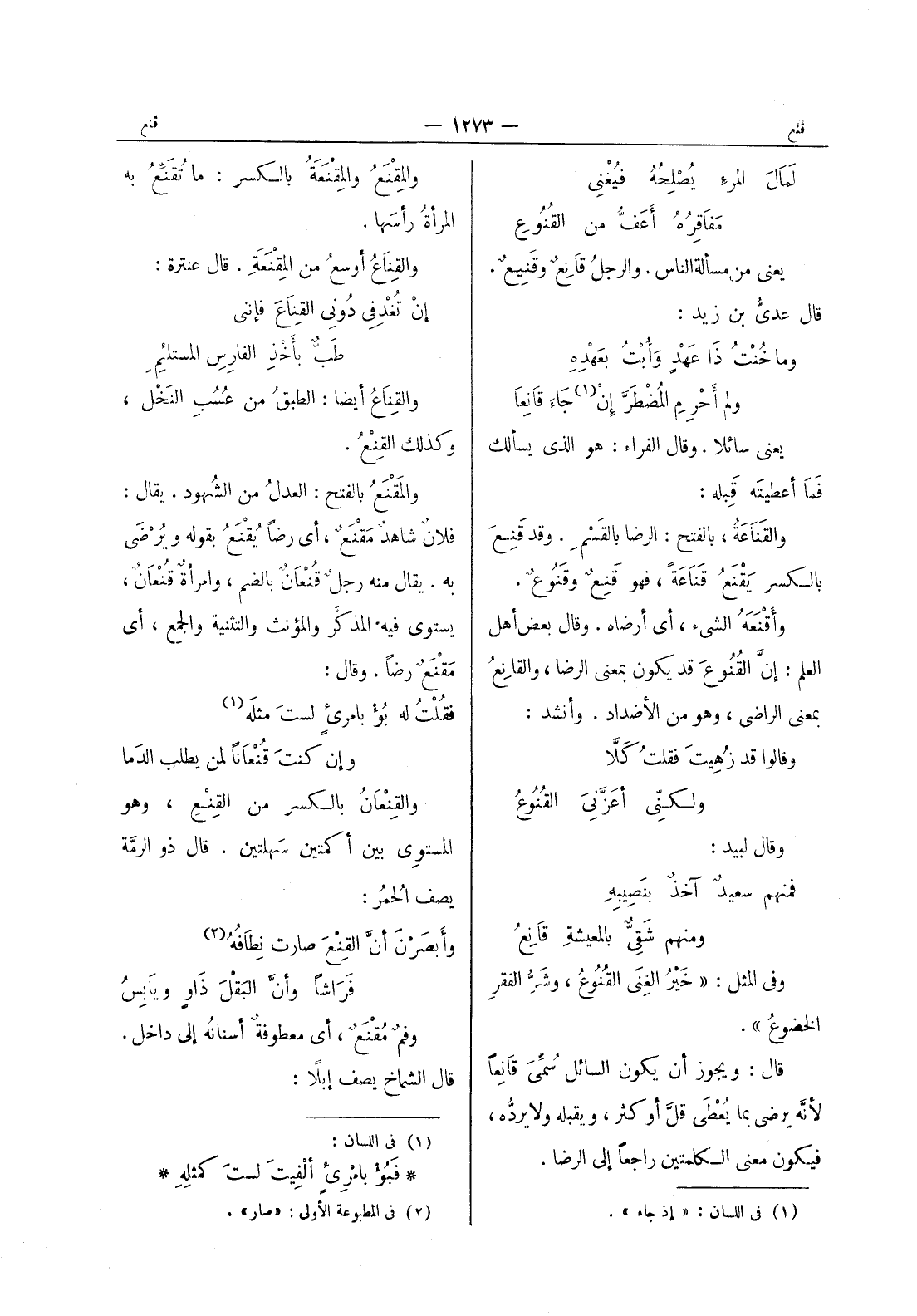 لمال المرء يصلحه فيغنى * مفاقره أعف من القُنوعِ * يعني من مسألة الناس. والرجلُ قانِعٌ وقَنيعٌ. قال عديُّ بن زيد: وما خنتُ ذا عهْدٍ وأبْتُ بعهده * ولم أحْرِمِ المضطرَّ إن (¬1) جاَء قانِعا * يعني سائلاً. وقال الفراء: هو الذي يسألك فما أعطيته قَبِله: والقَناعَةُ، بالفتح: الرِضا بالقَسْمِ. وقد قَنِعَ بالكسر يَقْنَعُ قَناعَةً، فهو قَنِعٌ وقنوع. وأقعنه الشئ، أي أرضاه. وقال بعض أهل العلم: إنَّ القُنوعَ قد يكون بمعنى الرضا، والقانِعُ بمعنى الراضي، وهو من الأضداد. وأنشد: وقالوا قد زُهيتَ فقلتَ كلاَّ * ولكنِّي أعَزَّنِيَ القُنوع * وقال لبيد: فمنهم سعيدٌ آخذٌ بنَصيبِهِ * ومنهم شقيٌّ بالمعيشَةِ قانِعُ * وفي المثل: " خيرُ الغِنى القُنوعُ، وشرُّ الفقرِ الخُضوعُ ". قال: ويجوز أن يكون السائل سمِّي قانِعاً لأنَّه يرضى بما يعطى قلَّ أو كثر، ويقبله ولا يردُّه، فيكون معنى الكلمتين راجعاً إلى الرضا.