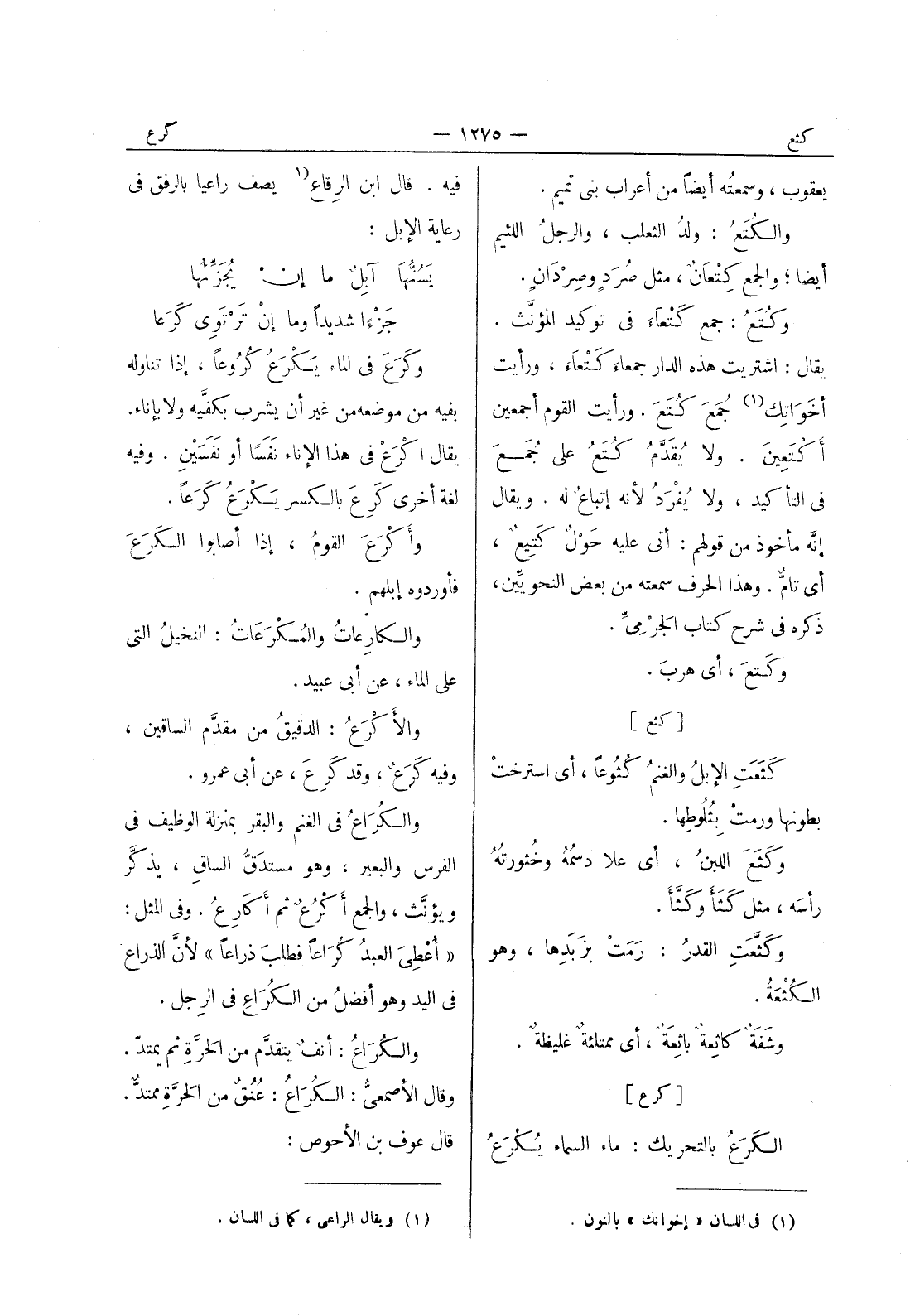 فيه. قال ابن الرقاع (¬1) يصف راعيا بالرفق في رعاية الابل: يسنها آبل ما إن يجزئها * جزءا شديدا وما إن ترتوى كرعا * وكرع في الماء يَكْرَعُ كُروعاً، إذا تناوله بفيه من موضعه من غير أن يشرب بكفَّيه ولا بإناء. يقال اكْرَعْ في هذا الإناء نَفَساً أو نَفَسَيْنِ. وفيه لغة أخرى كَرِعَ بالكسر يَكْرَعُ كَرَعاً. وأكْرَعَ القومُ، إذا أصابوا الكَرَعَ فأوردوه إبلهم. والكارِعاتُ والمُكْرَعاتُ: النخيل التي على الماء، عن أبى عبيد. والاكرع: الدقيق من مقدَّم الساقين، وفيه كَرَعٌ، وقد كرع، عن أبى عمرو. والكراع في الغنم والبقر بمنزلة الوظيف في الفرس والبعير، وهو مستدَقُّ الساقِ، يذكَّر ويؤنَّث، والجمع أكْرُعٌ ثمَّ أكارِعُ. وفي المثل: " أعطيَ العبدُ كُراعاً فطَلَبَ ذراعاً " لأنَّ الذراع في اليد وهو أفضلُ من الكُراعِ في الرِجل. والكُراعُ: أنفٌ يتقدَّم من الحَرَّةِ ثمَّ يمتدٌّ. وقال الأصمعيّ: الكُراعُ: عُنُقٌ من الحَرَّةِ ممتدٌّ. قال عوف بن الاحوص