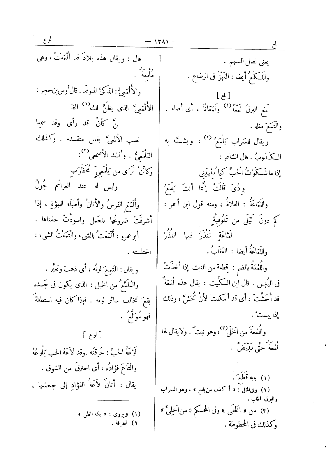 [لمع] لمعَ البرقُ لَمْعاً (¬1) ولَمَعاناً، أي أضاء. والْتَمَعَ مثله. ويقال للسراب يَلْمَعُ (¬2) ، ويشبَّه به الكَذوبُ. قال الشاعر: إذا ما شَكَوْتُ الحُبَّ كيما تُثيبَني * بوِدِّي قالتْ إنَّما أنتَ يَلْمَعُ * واللَماعَةُ: الفلاةُ، ومنه قول ابن أحمر: كم دونَ لَيْلى من تَنوفِيَّةٍ * لَمَّاعَةٍ تُنْذَرُ فيها النُذرْ * واللَماعَةُ أيضاً: العُقابُ. واللُمْعَةُ بالضم: قِطعة من النبت إذا أخذت في اليُبس. قال ابن السكيت: يقال هذه لُمْعَةٌ قد أحَشَّتْ، أي قد أمكنت لان تحش، وذلك إذا يبستْ. واللُمْعَةُ من الخَلَى (¬3) ، وهو نبتٌ. ولا يقال لها لُمْعَةٌ حتى تبيض.
