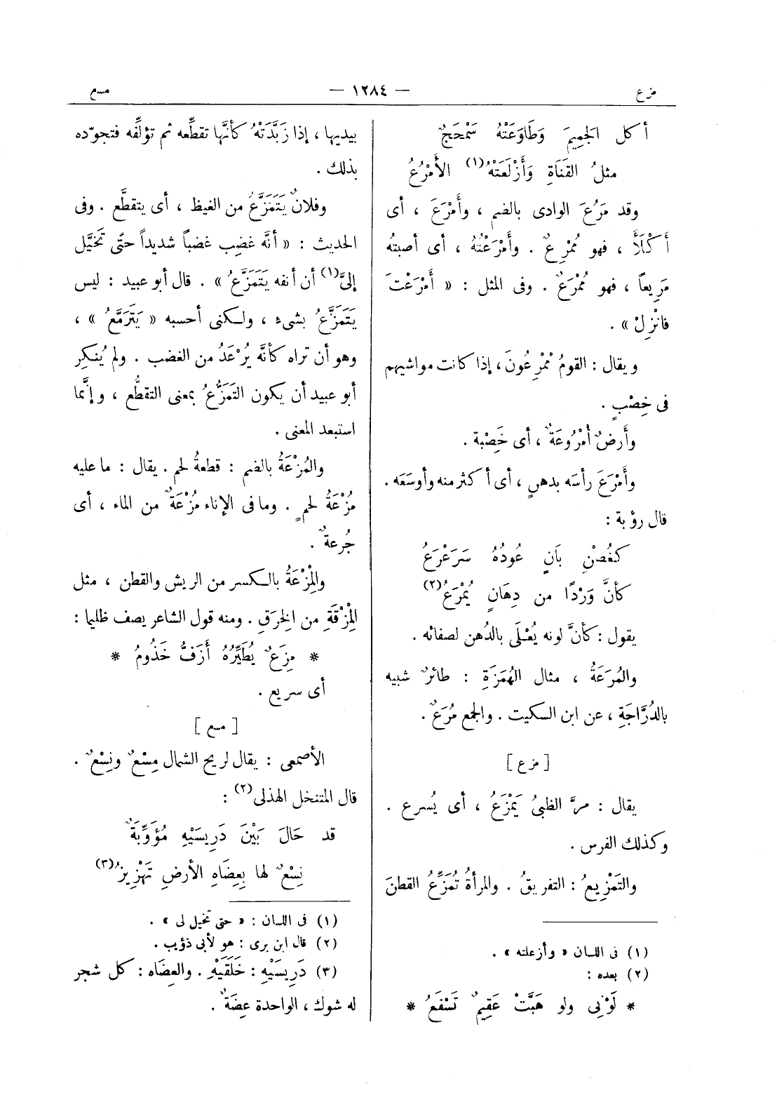 أكل الجَميمِ وطاوَعَتْهُ سَمْحَجٌ * مثلُ القناةِ وأَزْلَعَتْهُ (¬1) الأَمْرُعُ * وقد مَرُعَ الوادي بالضم، وأَمْرَعَ، أي أَكْلأَ، فهو مُمْرِعٌ. وأَمْرَعْتُهُ، أي أصبتهُ مَريعاً، فهو مُمْرَعٌ. وفي المثل: " أَمْرَعْتَ فانْزِلْ ". ويقال: القومُ مُمْرِعونَ، إذا كانت مواشيهم في خِصْبٍ. وأرضٌ أُمْروعَةٌ، أي خِصْبةٌ. وأَمْرَعَ رأسَه بدهنٍ، أي أكثر منه وأوسَعَه. قال رؤبة: كغصن بان عوده سرعرع * كأن وردا من دهان يمرع (¬2) * يقول: كأن لونه يعلى بالدهن لصفائه. والمرعة، مثال الهمزة: طائر شبيه بالدراجة، عن ابن السكيت. والجمع مرع.