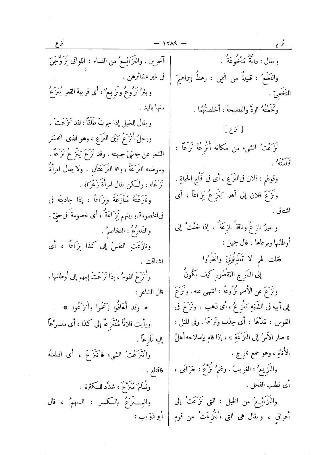 آخرين. والنزائع من النساء: اللواتي يُزَوَّجْنَ في غير عشائرهن. وبئرٌ نَزوعٌ ونَزيعٌ، أي قريبةُ القعر يُنْزَعُ منها باليد. ويقال للخيل إذا جرتْ طَلَقاً: لقد نَزَعَتْ. ورجلٌ أنْزَعُ بيِّنُ النَزَعِ، وهو الذي انحسرَ الشعر عن جانبي جبهته. وقد نَزَعَ يَنْزِعُ نَزْعاً. وموضعه النَزَعَةُ، وهما النَزَعَتانِ. ولا يقال امرأةٌ نَزْعاءُ، ولكن يقال امرأةٌ زَعْراءُ. ونازَعْتُهُ مُنازَعَةً ونزاعا، إذا جاذبته في في الخصومة. وبينهم نِزاعَةٌ، أي خصومةٌ في حقٍّ. والتَنازُعُ: التخاصمُ. ونازَعَتِ النفسُ إلى كذا نِزاعاً، أي اشتاقت. وأَنْزَعَ القومُ، إذا نَزَعَتْ إبلهم إلى أوطانها. قال الشاعر: