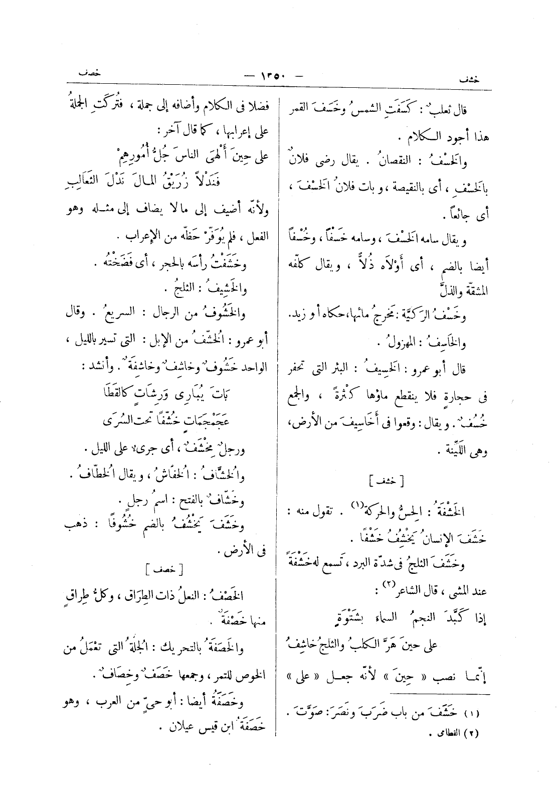 فضلا في الكلام وأضافه إلى جملة، فتركت الجملة على إعرابها، كما قال آخر: على حين ألهى الناس جل أمورهم فندلا زريق المال ندل الثعالب ولانه أضيف إلى ملا يضاف إلى مثله وهو الفعل، فلم يوفر حظه من الاعراب. وخشفت رأسه بالحجر، أي فَضَخْتُهُ. والخَشيف: الثلجُ. والخَشوفُ من الرجال: السريعُ. وقال أبو عمرو: الخُشَفُ من الإبل: التي تسير بالليل، الواحد خَشوفٌ وخاشف وخاشفة. وأنشد: بات يبارى ورشات كالقطا عجمجمات خشفا تحت السرى ورجل مخشف، أي جرئ على الليل. والخشاف: الخفاش، ويقال الخطاف. وخشاف بالفتح: اسم رجل. وخشف يخشف بالضم خشوفا: ذهب في الارض.