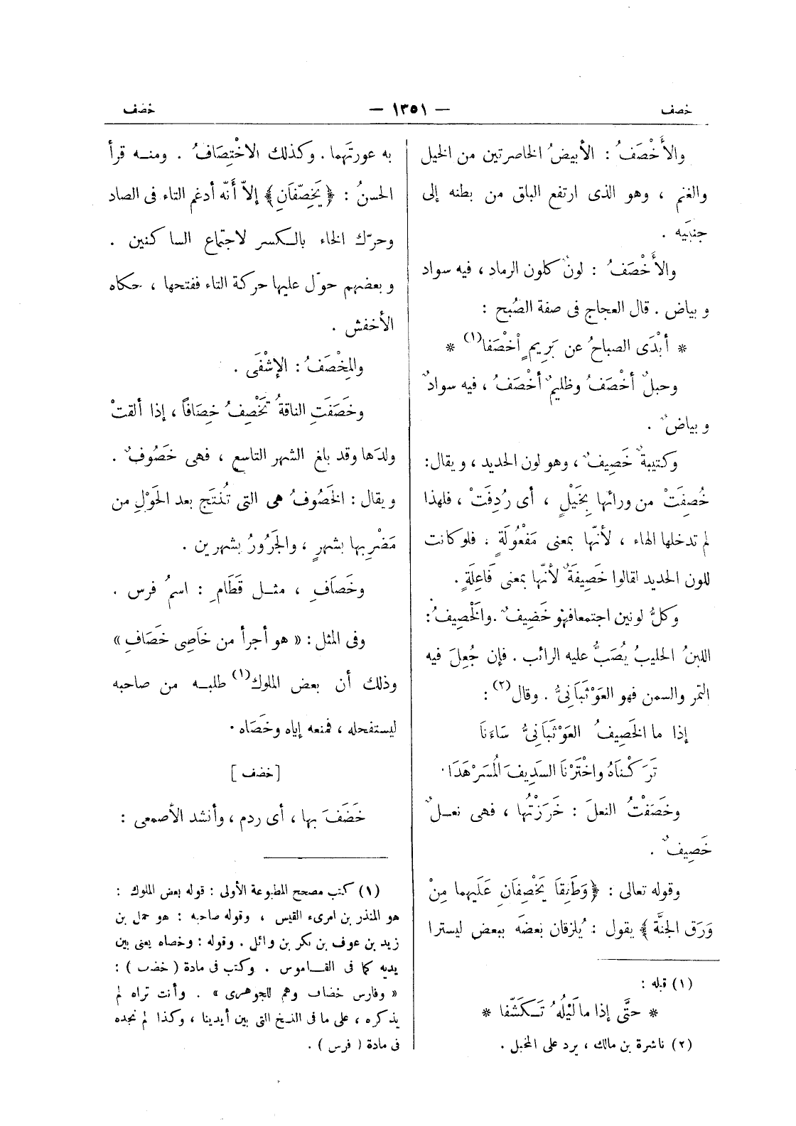 (¬1) كتب مصحح المطبوعة الاولى: قوله بعض الملوك: هو المنذر بن امرئ القيس: وقوله صاحبه: هو حمل بن زيد بن عوف بن بكر بن وائل. وقوله: وخصاه يعنى بين يديه كما في القاموس. وكتب في مادة (خضب) : " وفارس خضاف وهم للجوهري. وأنت تراه لم يذكره، على ما في النسخ التى بين أيدينا، وكذا لم نجده في مادة (فرس) .
