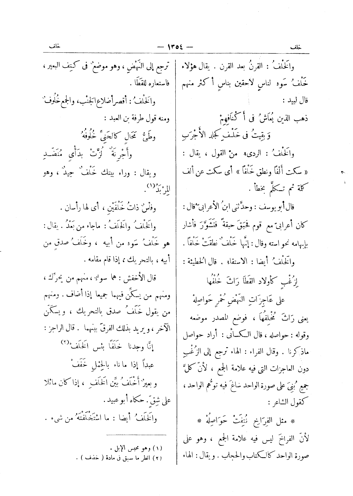 والخلف: القرنُ بعد القرن. يقال هؤلاء خلف سوء لناس لاحقين بناس أكثر منهم قال لبيد: ذهب الذين يُعاشُ في أَكْنافِهِمْ وَبقيتْ في خَلْفٍ كجلد الإَجْرَبِ والخَلْفُ: الردى من القول، يقال: " سكت أَلْفاً ونطق خَلْفاً " أي سكت عن ألف كلمة ثم تكلَّم بخطأ. قال أبو يوسف: وحدثني ابن الاعرابي قال: كان أعرابي مع قوم فحبق حبقة فتشور فأشار بإبهامه نحواسته وقال: إنها خلف نطقت خلفا. والخلف أيضا: الاستقاء. قال الحطيئة: لزغب كأولاد القطا راث خلفها على عاجزات النهض حمر حواصله يعنى راث مخلفها، فوضع المصدر موضعه وقوله: حواصله، قال الكسائي: أراد حواصل ما ذكرنا. وقال الفراء: الهاء ترجع إلى الزغب دون العاجزات التى فيه علامة الجمع، لان كل جمع بنى على صورة الواحد ساغ فيه توهم الواحد، كقول الشاعر: