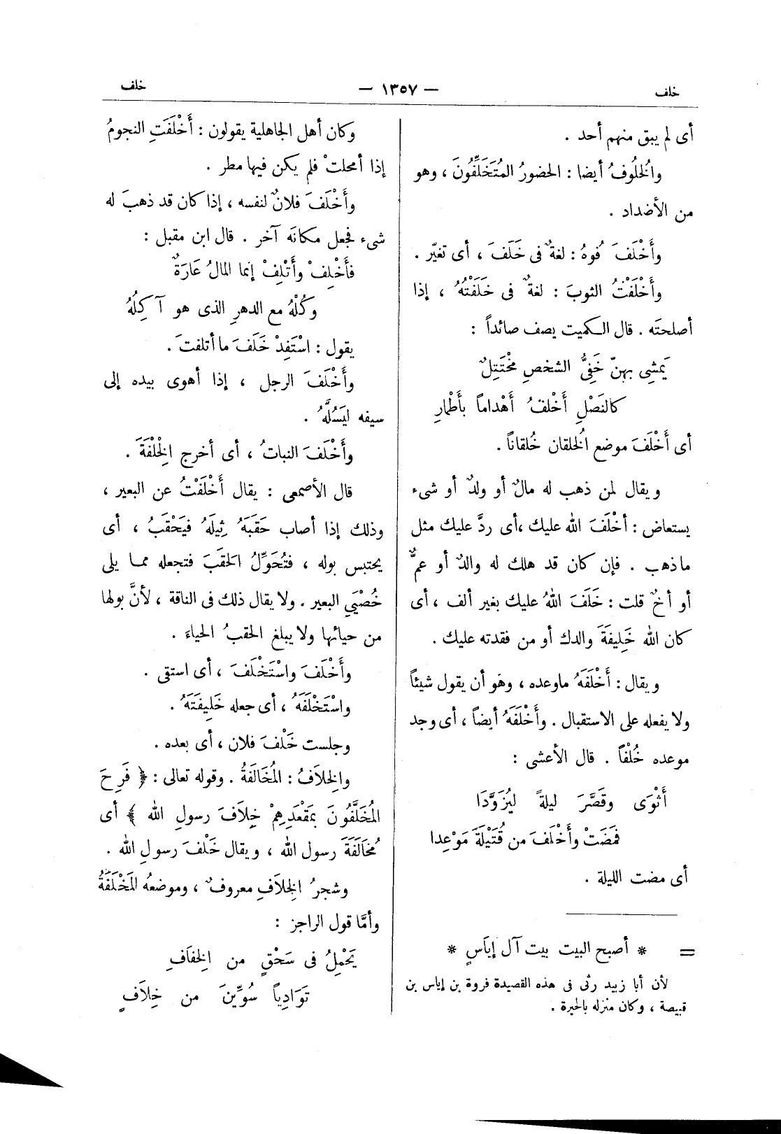أي لم يبق منهم أحد. والخلوفُ أيضاً: الحضورُ المُتَخَلِّفونَ، وهو من الأضداد. وأَخْلَفَ فوهُ: لغة في خَلَفَ، أي تغيّر. وأَخْلَفْتُ الثوبَ: لغةٌ في خَلَفْتُهُ، إذا أصلحتَه. قال الكميت يصف صائداً: يَمشي بهنّ خفى الشخص مختتل كالنصل أخلف أَهْداماً بأَطْمارِ أي أَخْلَفَ موضع الخُلقان خُلقاناً. ويقال لمن ذهب له مالٌ أو ولدٌ أو شئ يستعاض: أخلف الله عليك، أي ردَّ عليك مثل ما ذهب. فإن كان قد هلك له والدٌ أو عمٌّ أو أخٌ قلت: خَلَفَ اللهُ عليك بغير ألف، أي كان الله خَليفَةَ والدك أو من فقدته عليك. ويقال: أَخْلَفَهُ ما وعده، وهو أن يقول شيئاً ولا يفعله على الاستقبال. وأَخْلَفَهُ أيضاً، أي وجد موعده خُلْفاً. قال الاعشى: أثوى وقصر ليلة ليُزَوَّدا فَمَضَتْ وأَخْلَفَ من قُتَيْلَةَ موعدا أي مضت الليلة.