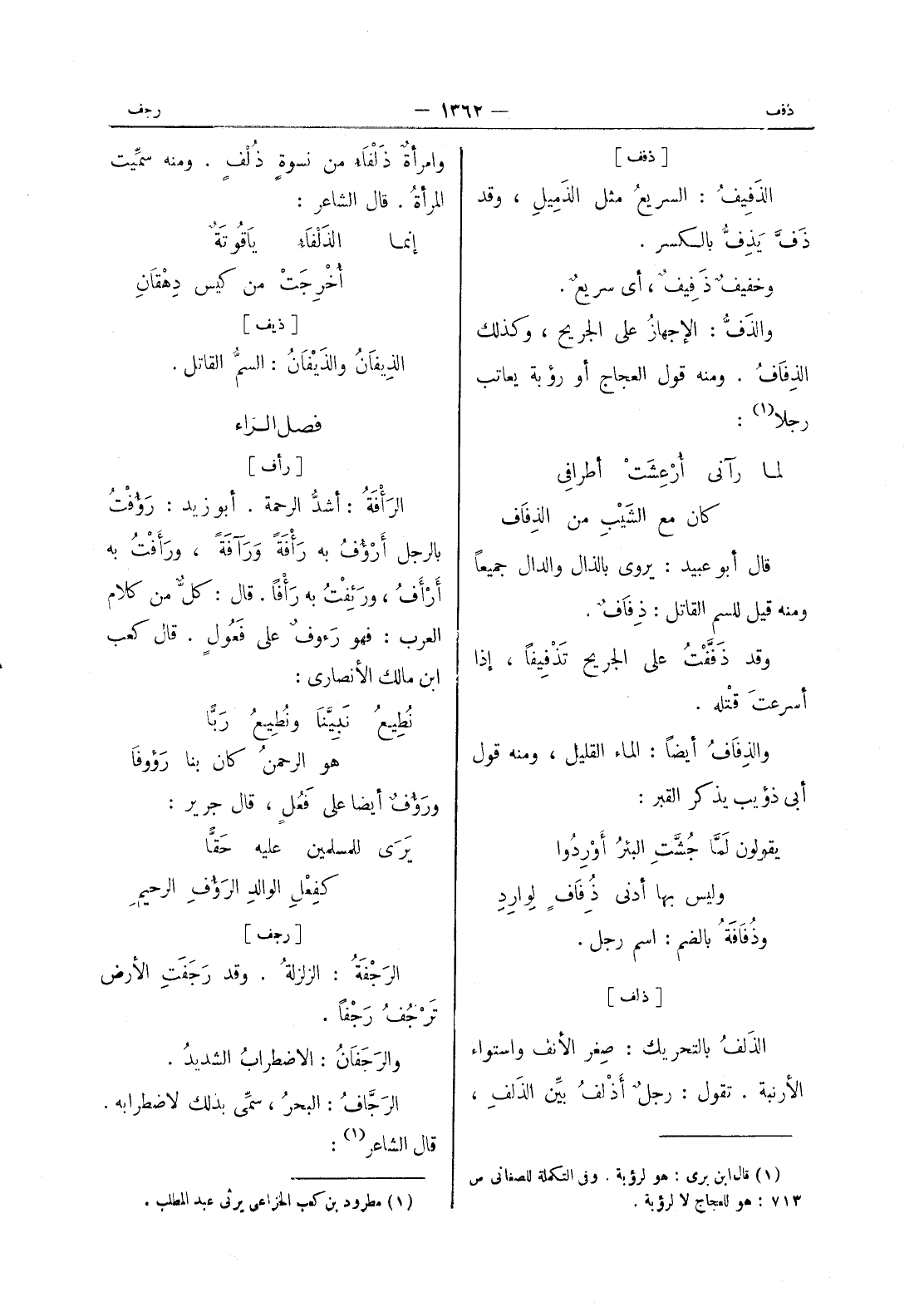[ذفف] الذَفيفُ: السريعُ مثل الذَميلِ، وقد ذَفَّ يَذِفُّ بالكسر. وخفيفٌ ذفيف، إى سريع. الذف: الاجهاز على الجريح، وكذلك الذِفافُ. ومنه قول العجاج أو رؤبة يعاتب رجلاً (¬1) : لما رآني أُرْعِشَتْ أطرافي كان مع الشَيْبِ من الذِفاف قال أبو عبيد: يروى بالذال والدال جميعاً ومنه قيل للسم القاتل: ذِفافٌ. وقد ذَفَّفْتُ على الجريح تَذْفيفاً، إذا أسرعتَ قتْله. والذِفافُ أيضاً: الماء القليل، ومنه قول أبي ذؤيب يذكر القبر: يقولون لمَّا جُشَّتِ البئرُ أَوْرِدوا وليس بها أدنى ذُفافٍ لِوارِدِ وذفافة بالضم: اسم رجل.