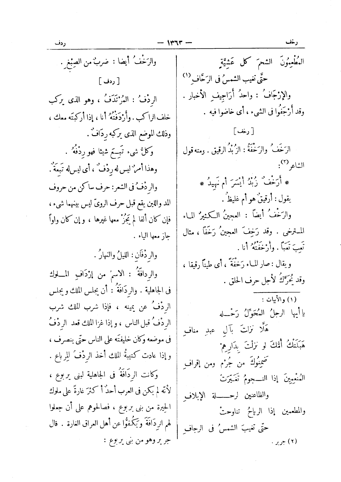 المطعمون الشحم كل عَشِيَّةٍ حتَّى تغيب الشمسُ في الرحاف (¬1) والارجاف: واحد أراجيف الاخبار. وقد أرجفوا في الشئ، أي خاضوا فيه.