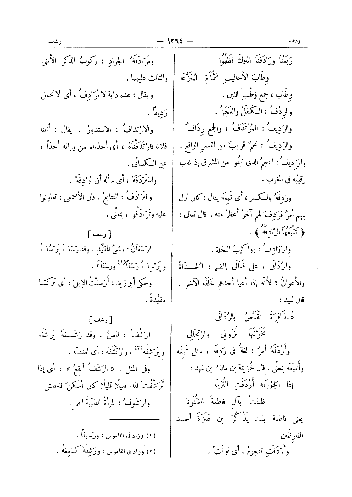 ربعنا ورادفنا الملوك فظللوا وطاب الاحاليب الثمام المنزعا وطاب، جمع وطب اللبن. والردف: الكفل والعجز. والرديف: المرتدف، والجمع رداف والرَديفُ: نجمٌ قريبٌ من النسر الواقِع. والرَديفُ: النجمُ الذي يَنُوء من المشرق إذا غاب رقيبُه في المغرب. ورَدِفَهُ بالكسر، أي تَبِعَهُ يقال: كان نزل: بهم أمرٌ فَردِفَ لهم آخرُ أعظمُ منه. قال تعالى: {تَتْبَعُها الرَّادِفَةُ} . والروادف: رواكيب النخلة. والراد في، على فعالى بالضم: الحداة والأعوانُ، لأنّه إذا أعيا أحدهم خلفه الآخر. قال ليبد: عذافرة تقمص بالردافى تخونها نزولي وارتحالي وأردفه أمر: لغة في ردفه، مثل تبعه وأتبعه بمعنى. قال خزيمة بن مالك بن نهد: إذا الجوزاء أردفت الثريا ظننت بآل فاطمة الظنونا يعنى فاطمة بنت يذكر بن عنزة أحد القارظين. وأردفت النجوم، أي توالت.