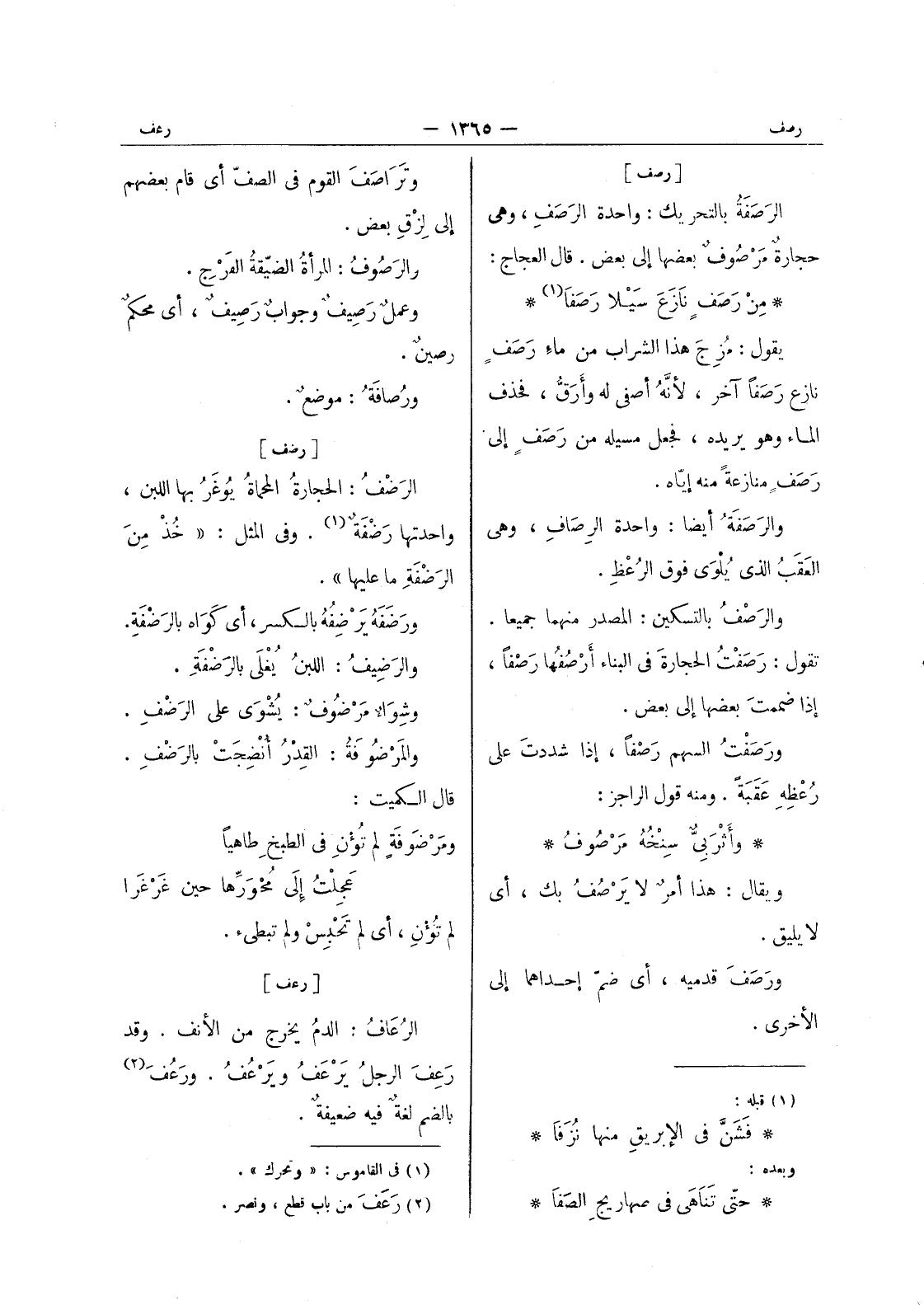 وأثر بي سنخه مرصوف * ويقال: هذا أمر لا يَرْصُفُ بك، أي لا يليق. ورَصَفَ قدميه، أي ضم إحداهما إلى الاخرى.