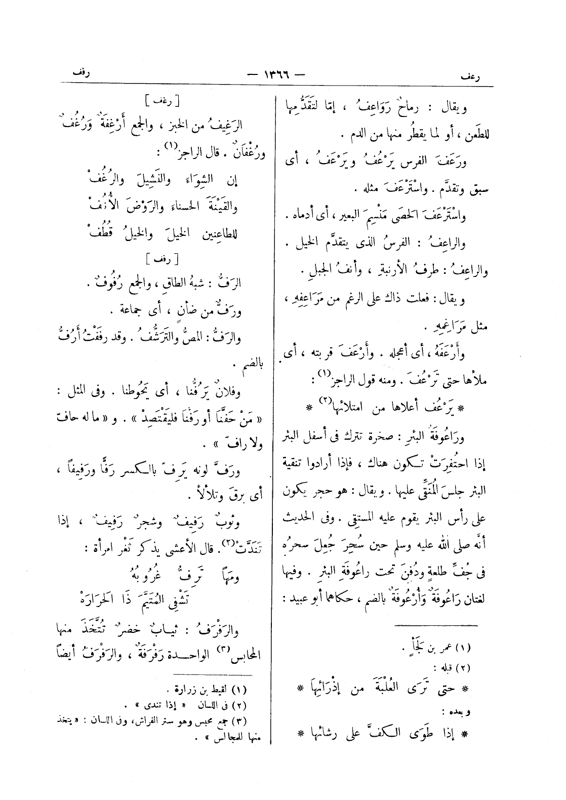 يرعف أعلاها من امثلائها (¬2) * وراعوفة البئر: صخرة تترك في أسفل البئر إذا احتفرت تكون هناك، فإذا أرادوا تنقية البئر جلسَ المُنَقِّي عليها. ويقال: هو حجر يكون على رأس البئر يقوم عليه المستقى. وفى الحديث أنَّه صلى الله عليه وسلم حين سحر جعل سحره في جف طلعة ودفن تحت راعوفة البئر. وفيها لغان راعوفة وأرعوفة بالضم، حكاهما أبو عبيد