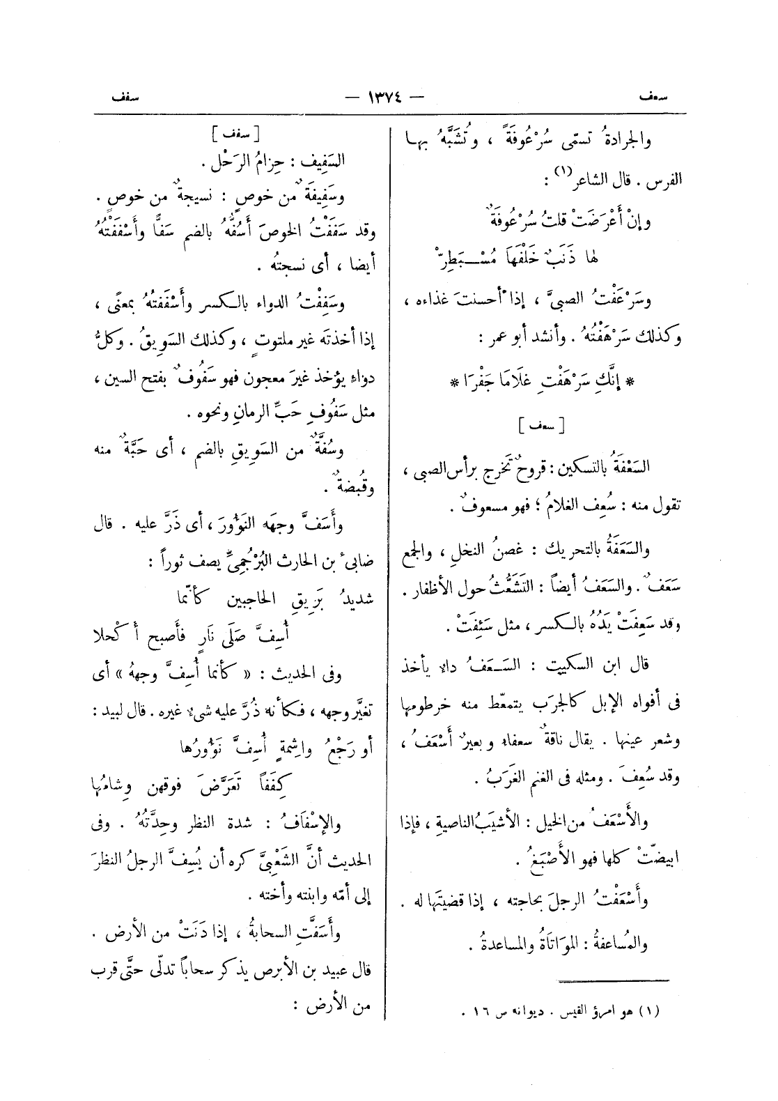 [سفف] السفيف: حزام الرحل. مسفيفة من خوصٍ: نسيجةٌ من خوصٍ. وقد سَفَفْتُ الخوصَ أَسُفُّهُ بالضم سَفَّاً وأَسْفَفْتُهُ أيضاً، أي نسجتُه. وسففت الدواء بالكسر أسففته بمعنى، إذا أخذتَه غير ملتوتٍ، وكذلك السَويقُ. وكلُّ دواءٍ يؤخذ غيرَ معجون فهو سَفوفٌ بفتح السين، مثل سَفُوفِ حبِّ الرمانِ ونحوه. وسُفَّةٌ من السَويقِ بالضم، أي حَبَّةٌ منه وقُبْضَةٌ. وأَسَفَّ وجهَه النؤور، أي ذر عليه. قال ضابئ بن الحارث البُرْجُمِيِّ يصف ثوراً: شديدُ بَريقِ الحاجبين كأنّما أُسِفَّ صَلى نارٍ فأَصبح أَكْحلا وفي الحديث: " كأنما أُسِفَّ وجْههُ " أي تغيَّر وجهه، فكأنه ذُرَّ عليه شئ غيره. قال لبيد: أو رَجْعُ واشِمةٍ أُسِفُّ نَؤُورُها كِفَفاً تَعَرَّضَ فوقهن وِشامُها والإِسْفافُ: شدة النظر وحدته. وفى الحديث أن الشعبى كره أن يسف الرجل النظر إلى أمه وابنته وأخته. وأسفت السحابة، إذا دَنَتْ من الأرض. قال عبيد بن الابرص يذكر سحابا تدلّى حتَّى قرب من الأرض: