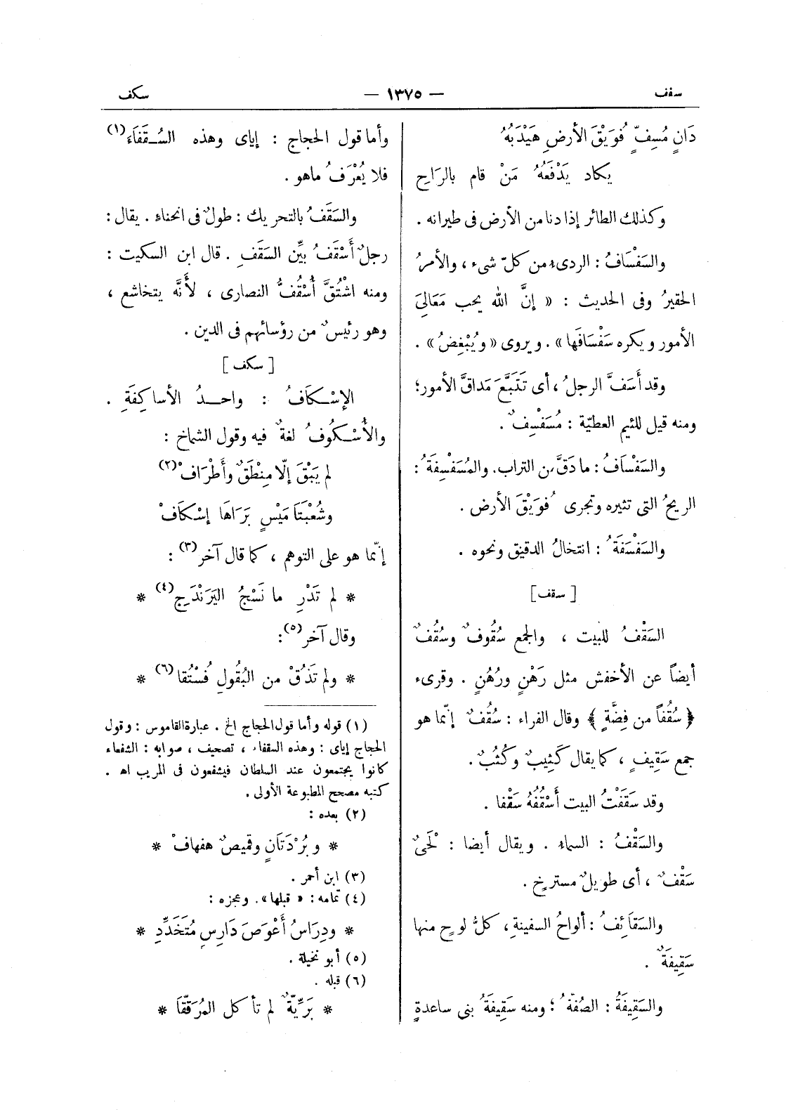 (¬1) قوله وأما قول الحجاج الخ. عبارة القاموس: وقل الحجاج إياى: وهذه السقفاء، تصحيف، صوابه: الشفعاء كانوا يجتمعون عند السلطان فيشفعون في المريب اه. كتبه مصحح المطبوعة الاولى.