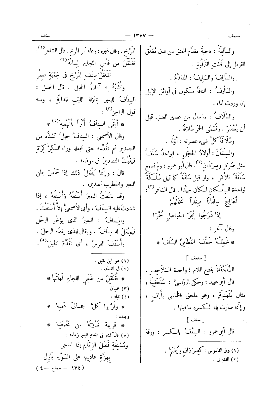 والسالفة: ناحية مقدَّم العنق من لدن مُعَلَّق القرطِ إلى قَلْتِ التَرقوةِ. والسالِفُ والسليف: المتقدم. والسلوف: النافة تكون في أوائل الإبل إذا وردت الماء. والسُلافُ: ما سال من عصير العنب قبل أن يُعْصَرَ. وتُسَمَّى الخمرُ سُلافاً. وسُلافَةُ كلِّ شئ عصرته: أوله. والسلفان: أولاد الحجل، الواحد سلف مثل صرد وصردان (¬1) . قال أبو عمرو: ولم نسمع سلفة للانثى، ولو قيل سلفة كما قيل سلكة لواحدة السلكان لكان جيدا. قال الشاعر (¬2) : أُعالِجُ سِلْفاناً صِغاراً تَخالُهُمْ إذا درجوا بجر الحواصل حمرا وقال آخر: