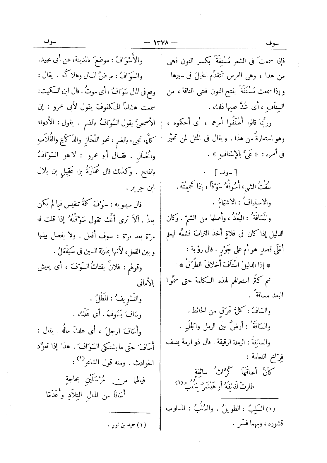 والاسواف: موضع بالمدينة، عن أبى عبيد. والسواف: مرضُ المال وهلاكه. يقال: وقع في المال سَوافٌ، أي موتٌ. قال ابن السكيت: سمعت هشاماً المكفوفَ يقول لأبي عمرو: إن الأصمعيَّ يقول السُوافُ بالضم. يقول: الادواء كلها تجئ بالضم، نحو النحاز والدكاع والقلاب والخمال فقال أبو عمرو: لاهو السواف بالفتح. وكذلك قال عمارة بن عقيل بن بلال ابن جرير. قال سيبويه: سَوْفَ كلمةُ تنفيس فيما لم يكن بعدُ. ألاَ ترى أنَّك تقول سَوَّفْتُهُ إذا قلت له مرّة بعد مرّة: سوف أفعل. ولا يفصل بينها وبين الفعل، لأنها بمنزلة السين في سَيَفْعَلُ. وقولهم: فلانٌ يقتاتُ السَوْفَ، أي يعيش بالأماني والتَسْويفُ: المَطْلُ. وسافَ يسوفُ، أي هَلَك. وأَسافَ الرجلُ، أي هلكَ مالُه. يقال: أَسَافَ حتّى ما يشتكي السَوافَ. هذا إذا تعوَّد الحوادث. ومنه قول الشاعر (¬1) : فيالهما من مُرْسَلَيْنِ بحاجةٍ أَسافا من المالِ التلاد وأعدما