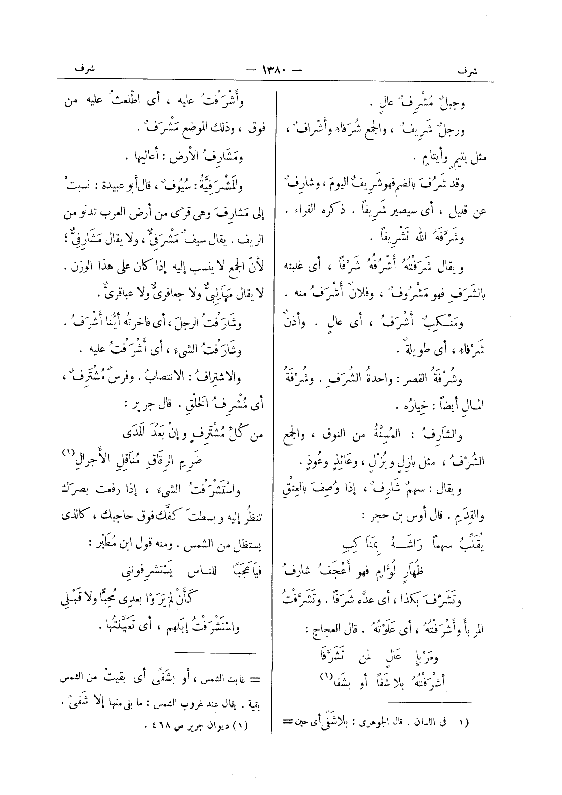 وأشرفت عليه، أي اطلعت عليه من فوق، وذلك الموضع مَشْرَفٌ. ومَشارِفُ الأرض: أعاليها. والمَشْرَفِيَّةُ: سُيوفٌ، قال أبو عبيدة: نسبتْ إلى مَشارِفَ وهي قرىً من أرض العرب تدنو من الريف. يقال سيفٌ مَشْرَفِيٌّ، ولا يقال مَشارِفيٌّ، لأنّ الجمع لا ينسب إليه إذا كان على هذا الوزن. لا يقال مهالبى ولا جعافرى ولا عباقرى. وشارفت الرجل، أي فاخرته أينا أشرف. وشارفت الشئ، أي أَشْرَفْتُ عليه. والاشتِرافُ: الانتصابُ. وفرسٌ مشترف، أي مشرف الخلق. قال جرير: من كلِّ مُشْتَرِفٍ وإنْ بَعُدَ المَدى ضَرِمِ الرِقاقِ مناقل الاجرال (¬1) واستشرفت الشئ، إذا رفعت بصرك تنظر إليه وبسطتَ كفَّك فوق حاجبك، كالذي يستظل من الشمس. ومنه قول ابن مُطَيْر: فيا عجباً للناس يَسْتشرِفونني كَأَنْ لم يَرَوْا بعدى محبا ولاقبلى واستشرفت إبلهم، أي تعينتها.