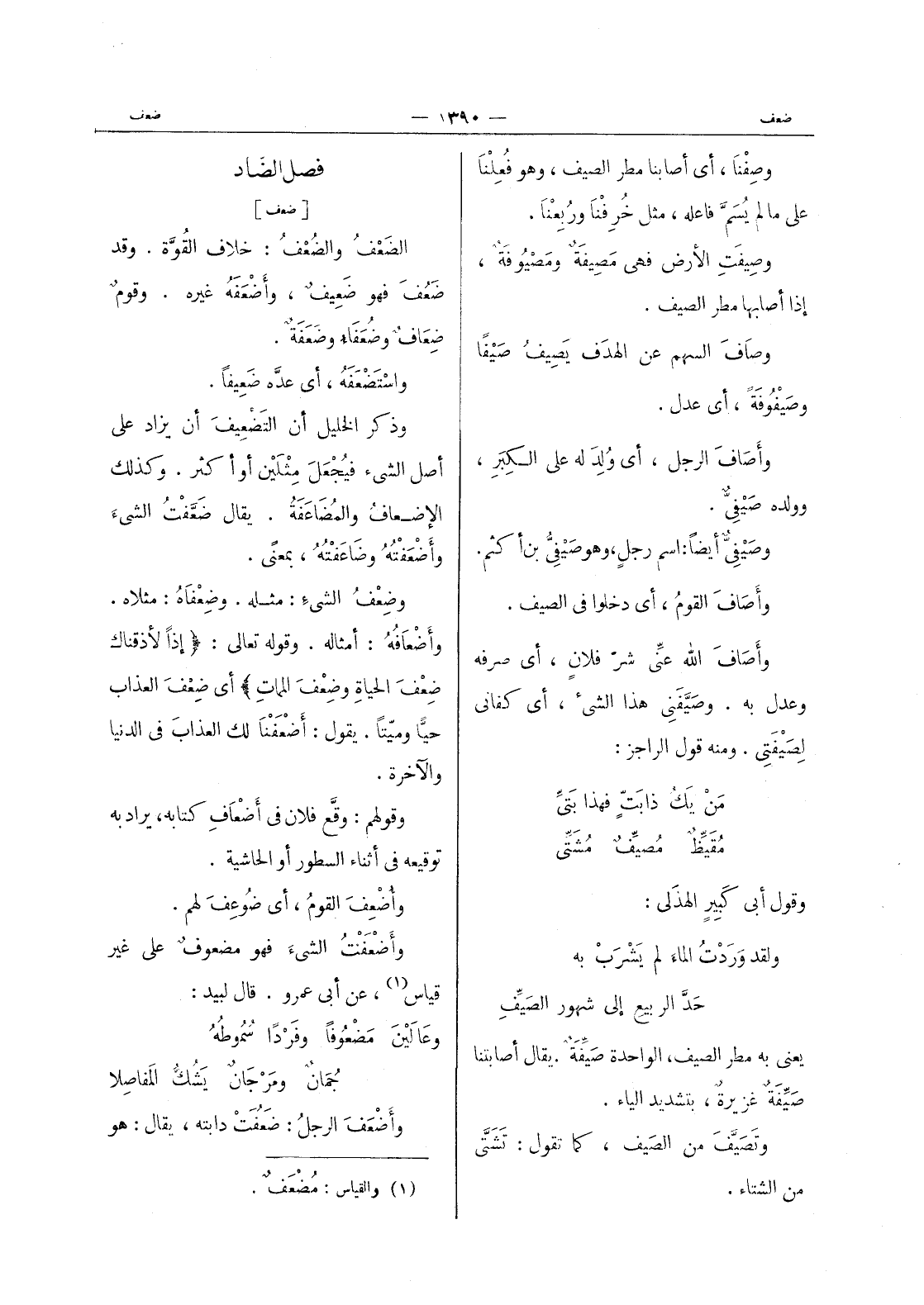 [ضعف] الضَعْفُ والضُعْفُ: خلاف القوَّة. وقد ضَعُفَ فهو ضعيفٌ، وأضْعَفَهُ غيره. وقومٌ ضِعافٌ وضُعَفاءُ وضَعَفَةٌ. واسْتَضْعَفَهُ، أي عدَّه ضَعيفاً. وذكر الخليل أن التَضْعيفَ أن يزاد على أصل الشئ فيجعل مثلين أو أكثر. وكذلك الإضعافُ والمُضاعَفَةُ. يقال ضعفت الشئ وأضعفته وضاعفته، بمعنى. وضعف الشئ: مثله. وضعفاه: مثلاه. وأضْعافُهُ: أمثاله. وقوله تعالى: {إذاً لأذقناك ضِعْفَ الحياةِ وضِعْفَ المماتِ} أي ضِعْفَ العذاب حيًّا وميّتا. يقول: أضْعَفْنا لك العذابَ في الدنيا والآخرة. وقولهم: وقَّع فلان في أضْعافِ كتابه، يراد به توقيعه في أثناء السطور أو الحاشية. وأُضْعِفَ القومُ، أي ضوعف لهم. وأضعفت الشئ فهو مضعوف على غير قياس (¬1) ، عن أبى عمرو. قال لبيد: وعالَيْنَ مَضعوفاً وفَرْداً سُموطُهُ جُمانٌ ومَرْجانٌ يَشُكُّ المفاصِلا وأضْعَفَ الرجلُ: ضَعُفَتْ دابته، يقال: هو