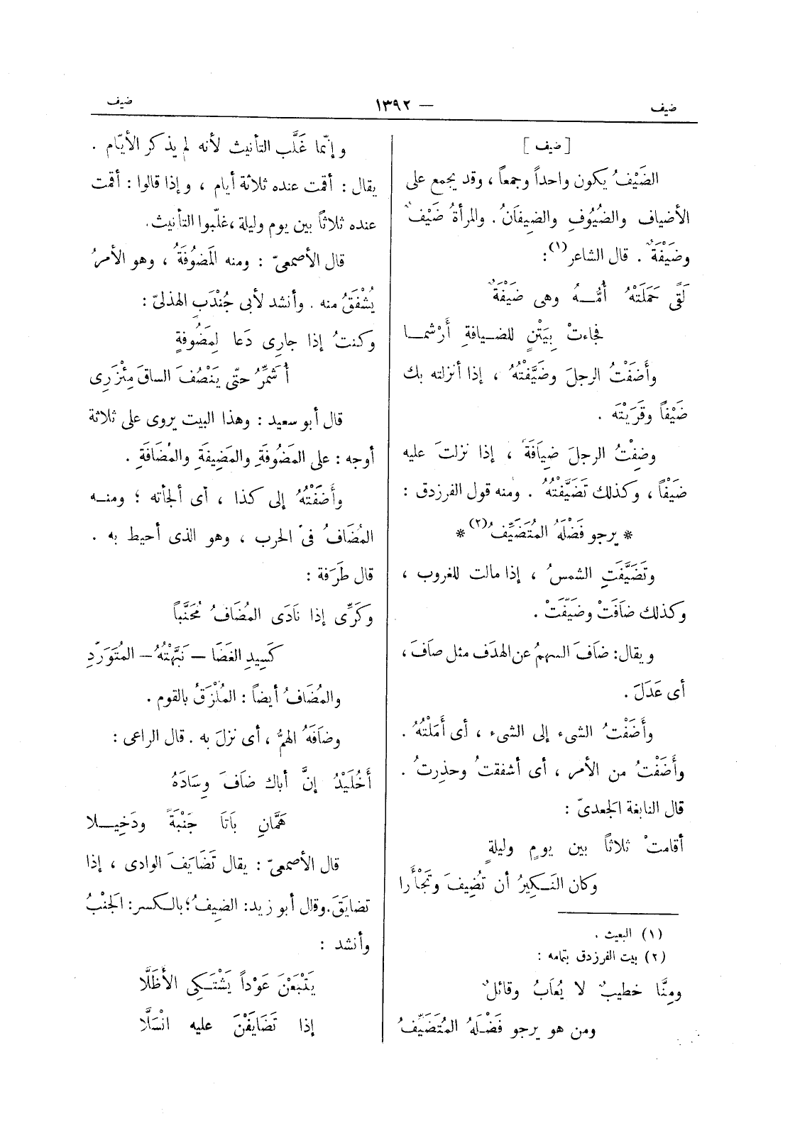 وإنما غلب التأنيث لانه لم يذكر الايام. يقال: أقمت عنده ثلاثة أيام، وإذا قالوا: أقمت عنده ثلاثا بين يوم وليلة، غلبوا التأنيث. قال الاصمعي: ومنه المَضوفَةُ، وهو الأمرُ يُشْفقُ منه. وأنشد لأبي جندب الهذليّ: وكنتُ إذا جاري دَعا لِمَضوفةٍ أُشَمِّرُ حتَّى يَنْصُفَ الساقَ مِئْزَري قال أبو سعيد: وهذا البيت يروى على ثلاثة أوجه: على المضوفَةِ والمَضيفَةِ والمُضافَةِ. وأضَفْتُهُ إلى كذا، أي ألجأته، ومنه المضاف في الحرب، وهو الذي أحيط به. قال طرفة: وكرٍّى إذا نادى المضاف محنبا كسيد الغضا - نَبَّهْتُهُ - المُتَوَرِّدِ والمُضافُ أيضاً: المُلْزَقُ بالقوم. وضافَهُ الهمُّ، أي نزلَ به. قال الراعي: أَخُلَيْدُ إنَّ أباك ضافَ وِسادهُ هَمَّانِ باتا جَنْبَةَ ودَخيلا قال الأصمعي: يقال تَضايَفَ الوادي، إذا تضايَقَ. وقال أبو زيد: الضيف، بالكسر: الجنب وأنشد: يَتْبَعْنَ عوْدا يشتَكي الأَظَلاَّ إذا تضايفن عليه انسلا