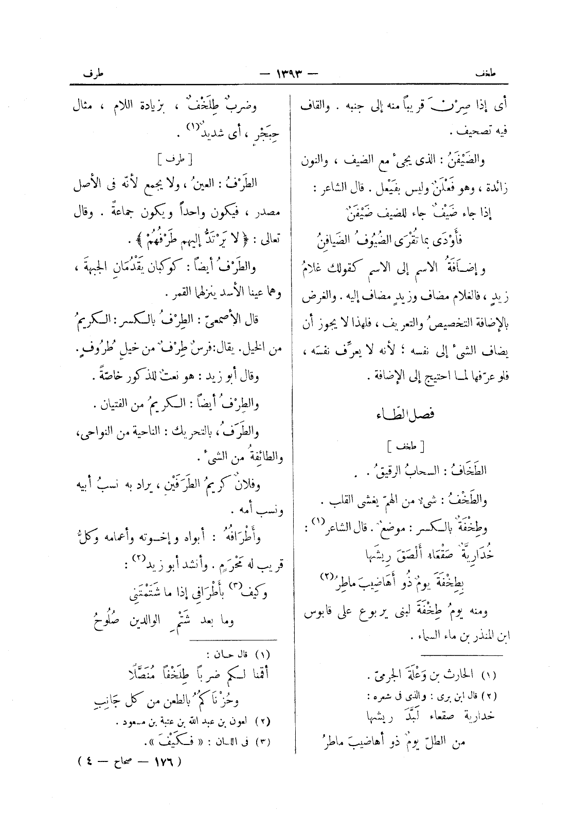 [طرف] الطَرْفُ: العينُ، ولا يجمع لأنّه في الأصل مصدر، فيكون واحداً ويكون جماعةً. وقال تعالى: {لا يَرْتَدُّ إليهم طَرْفُهُمْ} . والطَرْفُ أيضاً: كوكبان يَقْدُمانِ الجبهةَ، وهما عينا الأسد ينزلهما القمر. قال الأصمعي: الطِرْفُ بالكسر: الكريمُ من الخيل. يقال: فرسٌ طِرْفٌ من خيلٍ طُروفٍ. وقال أبو زيد: هو نعتٌ للذكور خاصّةً. والطِرْفُ أيضاً: الكريمُ من الفتيان. والطَرَفُ، بالتحريك: الناحية من النواحي، والطائِفةُ من الشئ. وفلان كريم الطرفين، يراد به نسب أبيه ونسب أمه. وأطْرافُهُ: أبواه وإخوته وأعمامه وكلُّ قريب له مَحْرَمٍ. وأنشد أبو زيد (¬2) : وكيفَ (¬3) بأطْرافي إذا ما شَتَمْتَني وما بعد شَتْمِ الوالدين صلوح