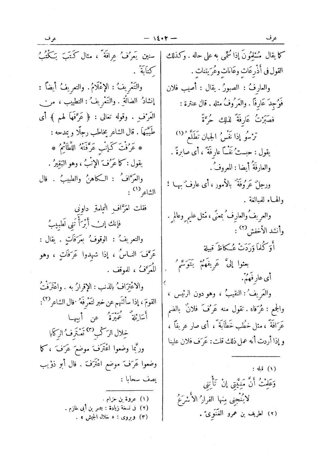 سنين يعرف عرافة، مثال كتب يكتب كتابة. والتعريف: الاعلام. والتعريف أيضا: إنشاد الضالة. والتَعْريفُ: التطييب، من العَرْفِ. وقوله تعالى: {عَرّفَها لهم} أي طَيَّبَها. قال الشاعر يخاطب رجلا ويمدحه: