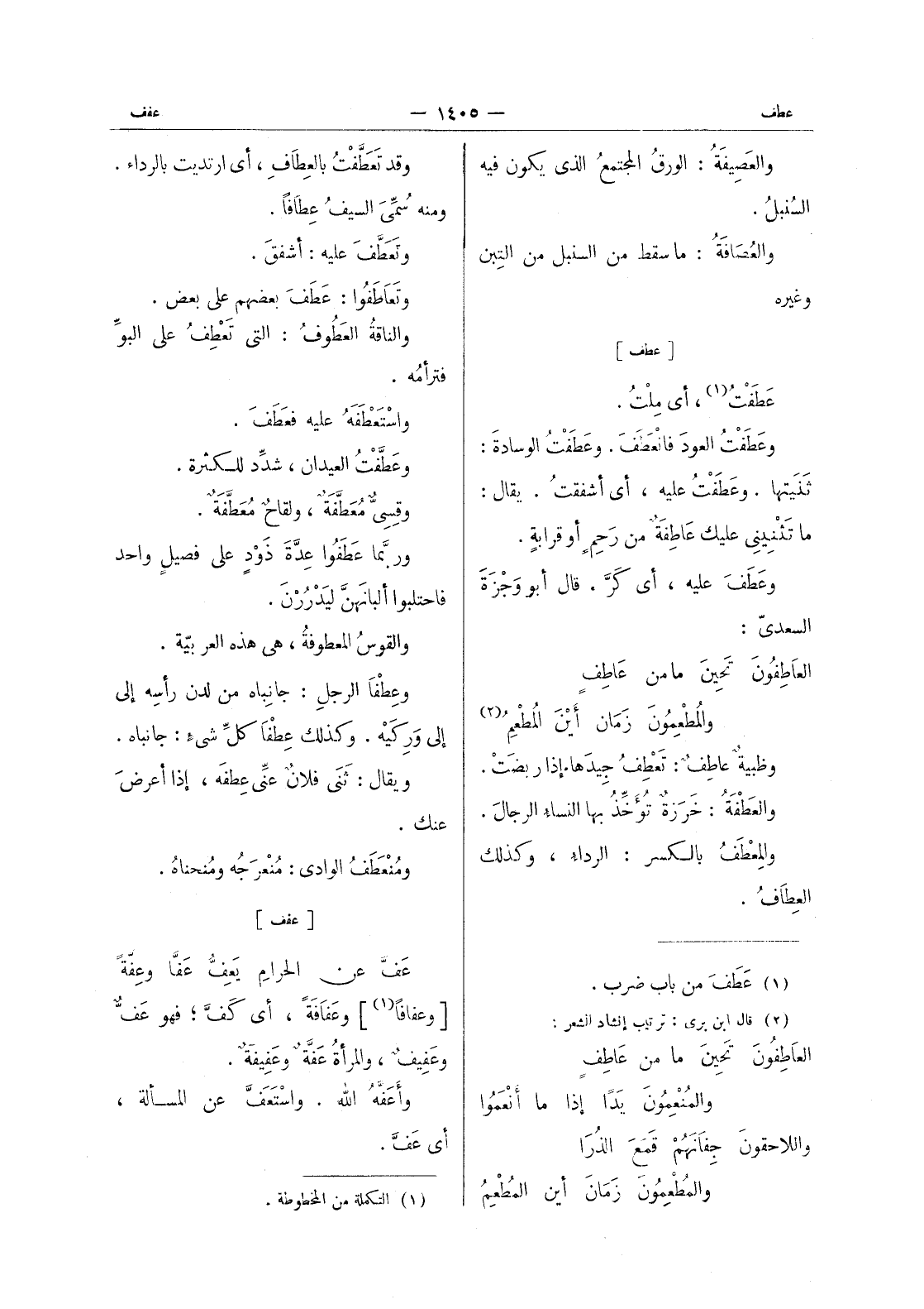 [عطف] عَطَفْتُ (¬1) ، أي مِلتُ. وعَطَفْتُ العودَ فانْعَطَفَ. وعَطَفْتُ الوسادةَ: ثنيتها. وعَطَفْتُ عليه، أي أشفقت. يقال: ما تثنينى عليك عاطفة من رَحِمٍ أو قرابةٍ. وعَطَفَ عليه، أي كرَّ. قال أبو وَجْزَةَ السعدى: العاطفون تحين مامن عاطِفٍ والمُطْعِمونَ زَمَان أينَ المُطْعِمُ (¬2) وظبيةٌ عاطِفٌ: تَعْطِف جيدَها إذا ربضت. والعَطْفَةُ: خَرَزَةٌ تُؤَخِّذُ بها النساء الرجال. والمعطف بالكسر: الرداء، وكذلك العطاف.