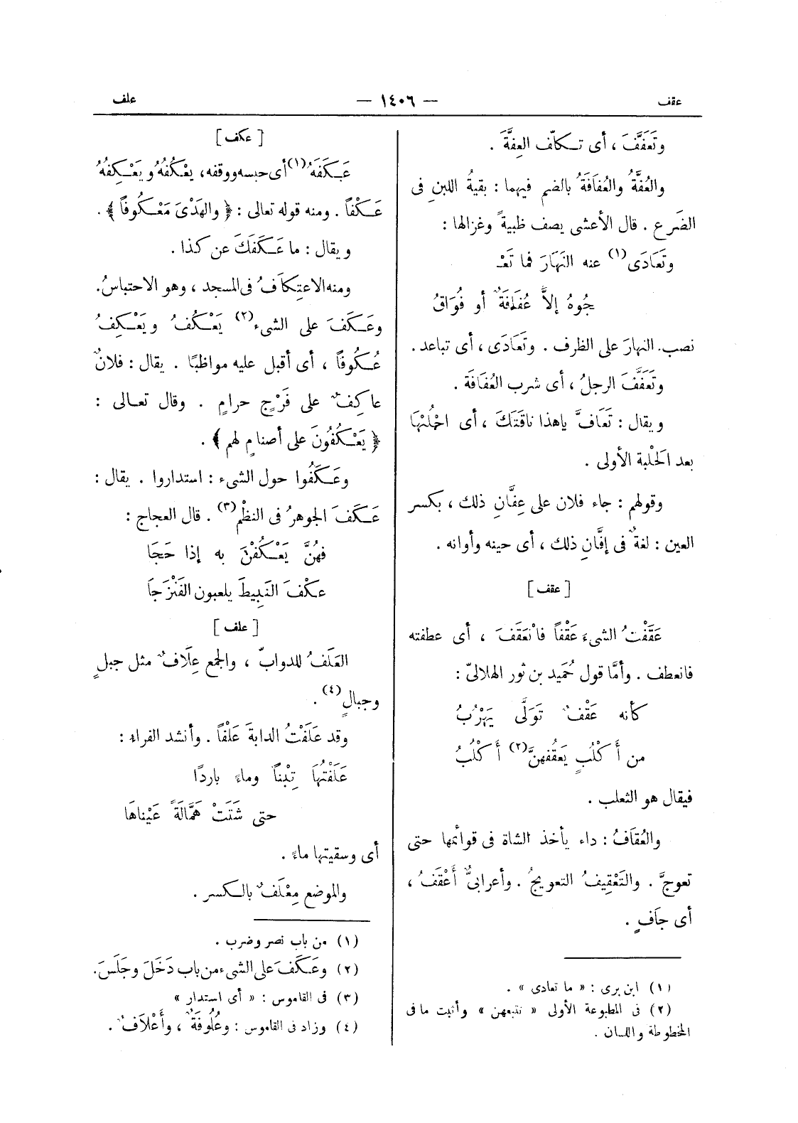 [عكف] عَكَفَهُ (¬1) أي حبسه ووقفه، يعكُفُهُ ويعكِفُهُ عَكْفاً. ومنه قوله تعالى: {والهَدْيَ مَعْكوفاً} . ويقال: ما عَكَفَكَ عن كذا. ومنه الاعتِكافُ في المسجد، وهو الاحتباس. وعَكَفَ على الشئ (¬2) يعكف ويعكف عكوفا، أي أقبل عليه مواظبا. يقال: فلان عاكف على فرج حرام. وقال تعالى: {يعكفون على أصنام لهم} . وعكفوا حول الشئ: استداروا. يقال: عكف الجوهر في النظم (¬3) . قال العجاج: فهن يعكفن به إذا حجا عكف النبيط يلعبون الفنزجا