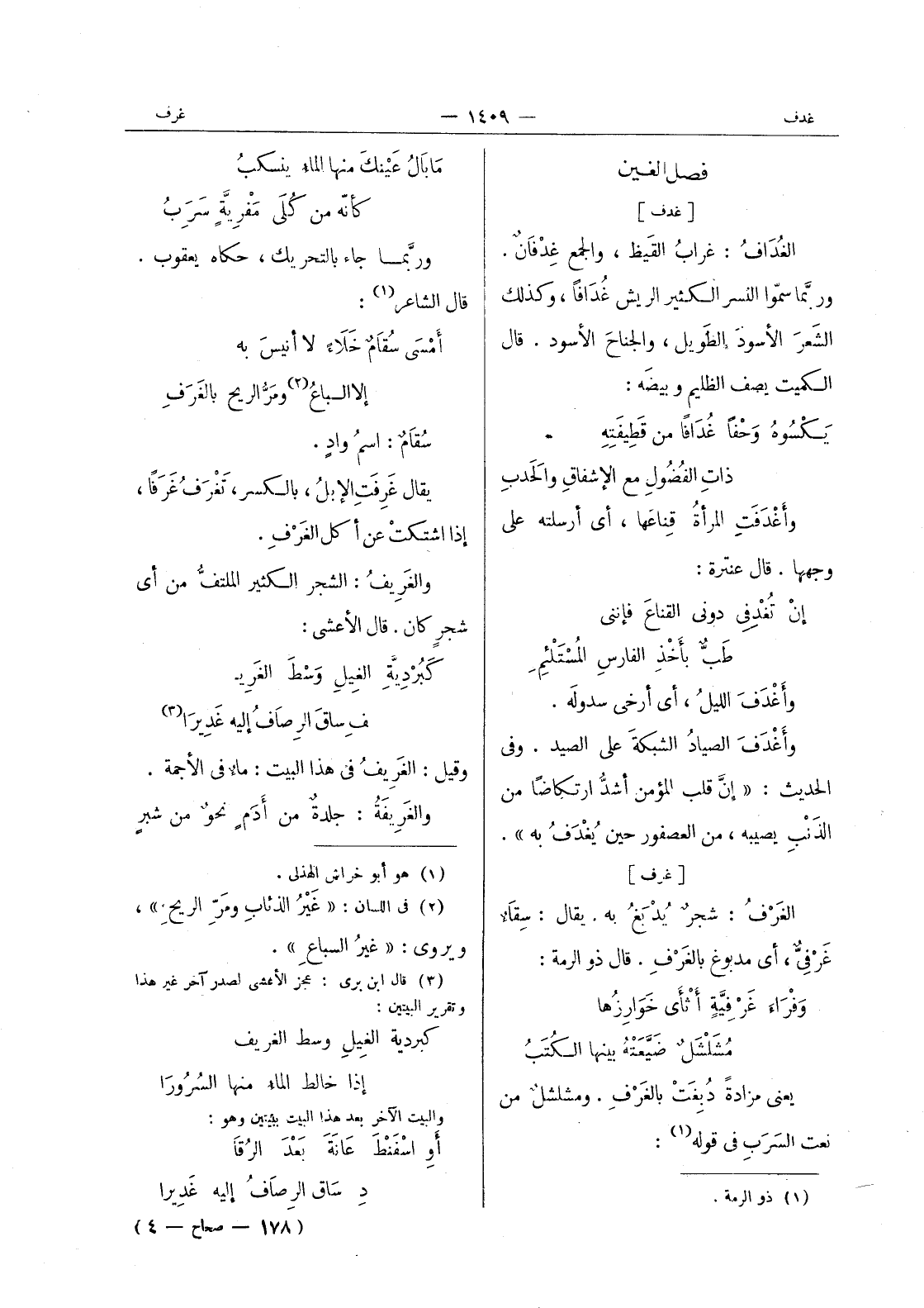 ما بال عينك منها الماءُ يَنْسَكِبُ كأنّه من كلى مفرية سرب وربما جاء بالتحريك، حكاه يعقوب. قال الشاعر (¬1) : أمسى سُقامٌ خَلاءً لا أنيسَ به إلا السباعُ (¬2) ومَرُّ الريح بالغَرَفِ سُقامٌ: اسمُ وادٍ. يقال غَرْفَت الإبل، بالكسر، تَغْرَفُ غَرَفاً، إذا اشتكت عن أكل الغَرْفِ. والغَريفُ: الشجر الكثير الملتفُّ من أي شجرٍ كان. قال الاعشى: كبردية الغيل وسط الغريف ساق الرصاف إليه غديرا (¬3) وقيل: الغريف في هذا البيت: ماء في الاجمة. والغريفة: جلدة من أدم نحو من شبر