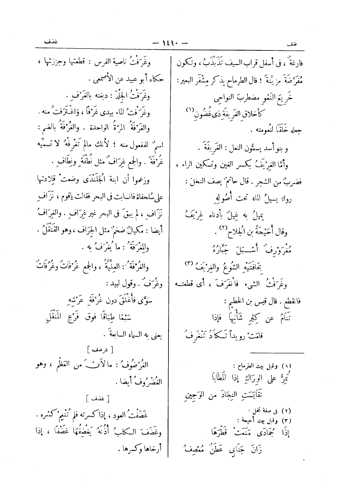 فارغة، في أسفل قراب السيف تَذَبْذَبُ، وتكون مفرضة مزينة، قال الطرماح يذكر مشفر البعير: خريع النعو مضطرب النواحى كأخلاق الغريفة ذى غضون (¬1) جعله خلقا لنعومته. وبنو أسد يسمون النعل: الغَريفَةَ. وأما الغِرْيَفُ بكسر الغين وتسكين الراء، فضربٌ من الشجر. قال حاتمٌ يصف النخل: رواءٌ يسيلُ الماءُ تحت أُصولِهِ يميلُ به غيلٌ بأدناه غِرْيَفُ وقال أحيحة بن الجلاح (¬2) . مغرورف أسبل جباره بحافتيه الشوع والغريف (¬3) وغرفت الشئ فانغرف، أي قطعته فانقطع. قال قيس بن الخطيم: تَنامُ عن كِبْرِ شَأنها فإذا قامت رويدا تكاد تنغرف