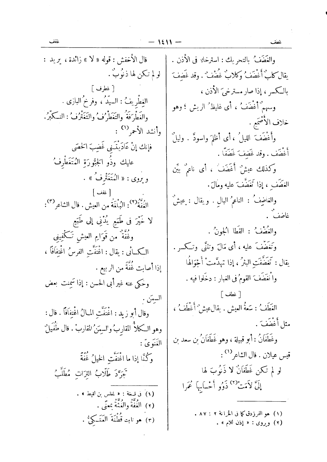 [غطف] الغَطَفُ: سَعة العيش. يقال عيش أغطف، مثل أغضف. وغطفان: أبو قبيلة، وهو غطفان بن سعد بن قيس عيلان. قال الشاعر (¬1) : لو لم تكن غطفان لاذنوب لها إلى لامت (¬2) ذوو أحسابها عمرا