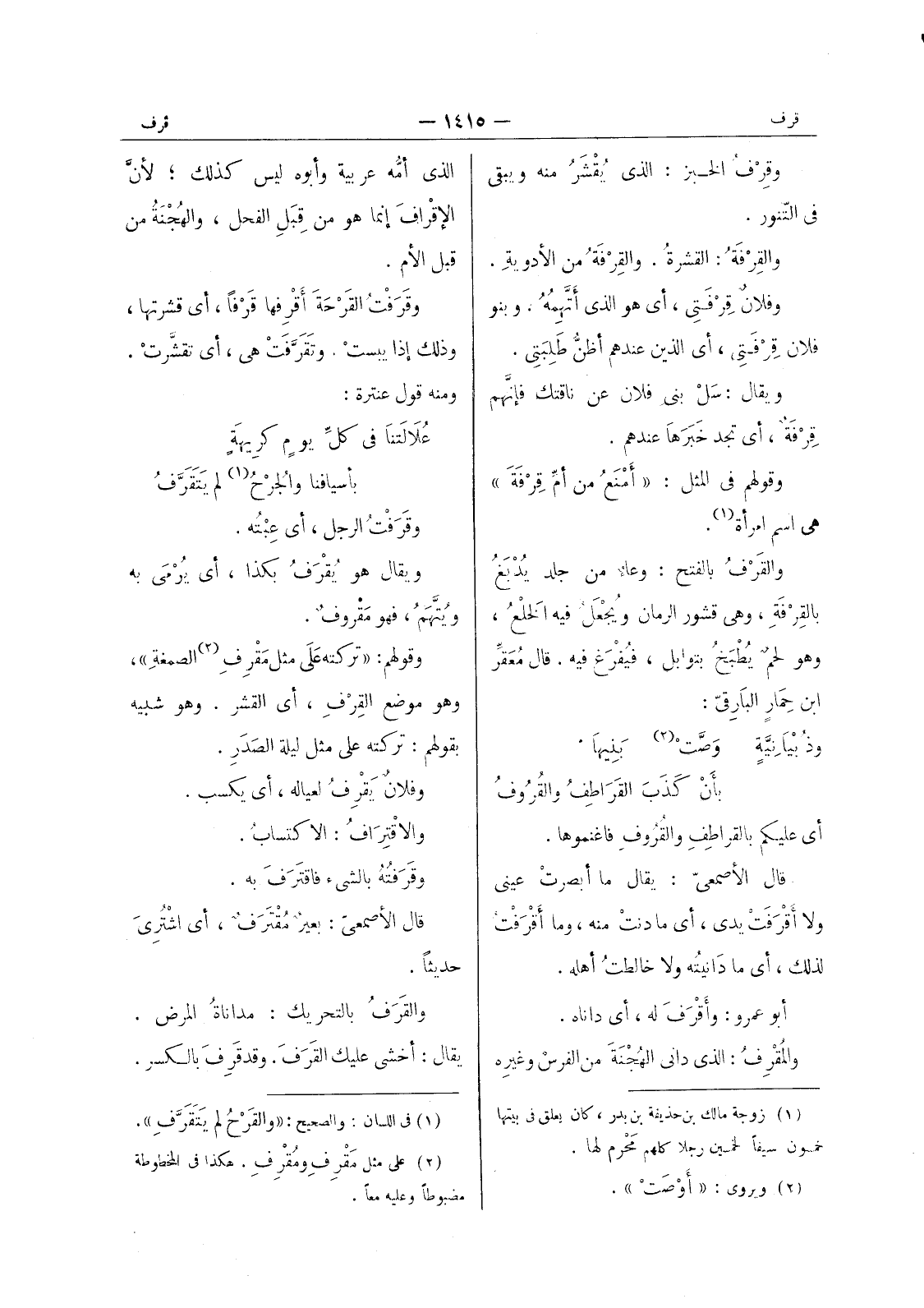 وقرف الخبز: الذي يُقشر منه ويبقى في التنُّور. والقِرْفَةُ: القشرة. والقِرْفَةُ من الأدوية. وفلانٌ قِرْفَتي، أي هو الذي أتَّهمه. وبنو فلان قِرْفَتي، أي الذين عندهم أظنُّ طَلِبَتي. ويقال: سَلْ بني فلان عن ناقتك فإنَّهم قِرْفَةٌ، أي تجد خبرها عندهم. وقولهم في المثل: " أمنع من أم قرفة " هي اسم امرأة (¬1) . والقرف بالفتح: وعاء من جلد يدبغ بالقرفة، وهى قشور الرمان ويجعل فيه الخلع، وهو لحمٌ يُطبخ بتوابل، فيُفرغ فيه. قال معقر ابن حمار البارقى: وذبيانية وصت (¬2) بنيها بأن كذب القراطف والقروف أي عليكم بالقراطف والقروف فاغنموها. قال الاصمعي: يقال ما أبصرت عيني ولا أقْرَفَتْ يدي، أي ما دنت منه، وما أقْرَفْتُ لذلك، أي ما دانيته ولا خالطت أهله. أبو عمرو: وأقْرَفَ له، أي داناه. والمُقْرِفُ: الذي دانى الهُجْنة من الفرس وغيره