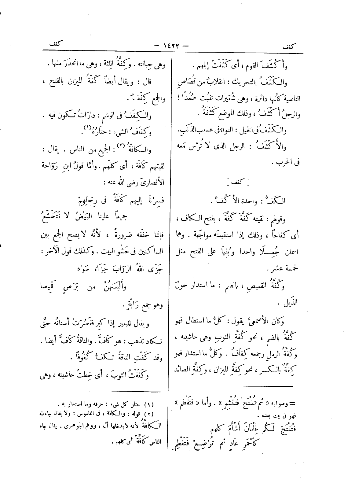 وهى حبالته. وكفة اللثة، وهي ما انحدر منها. قال: ويقال أيضاً كَفَّةُ الميزان بالفتح، والجمع كفف. والكفف. والكفف في الوشم: دارات تكون فيه. وكفاف الشئ: حتارُهُ (¬1) . والكافَّة (¬2) : الجميع من الناس. يقال: لقيتهم كافَّة، أي كلّهم. وأمَّا قول ابن رواحة الأنصاريّ رضي الله عنه: فسِرْنا إليهم كافَةً في رِحالِهِمْ جميعاً علينا البَيْضُ لا نَتَخَشَّعُ فإنَّما خفَّفه ضرورة، لأنَّه لا يصح الجمع بين الساكنين في حشو البيت. وكذلك قول الآخر: جزى الله الرواب جزاء سوء وألبسهن من برص قميصا وهو جمع رابة. ويقال للبعير إذا كبِر فقصُرت أسنانه حتَّى تكاد تذهب: هو كافٌّ. والناقةُ كافٌّ أيضاً. وقد كَفَّتِ الناقةُ تكفُّ كُفوفاً. وكَفَفْتُ الثوبَ، أي خِطتُ حاشيته، وهي