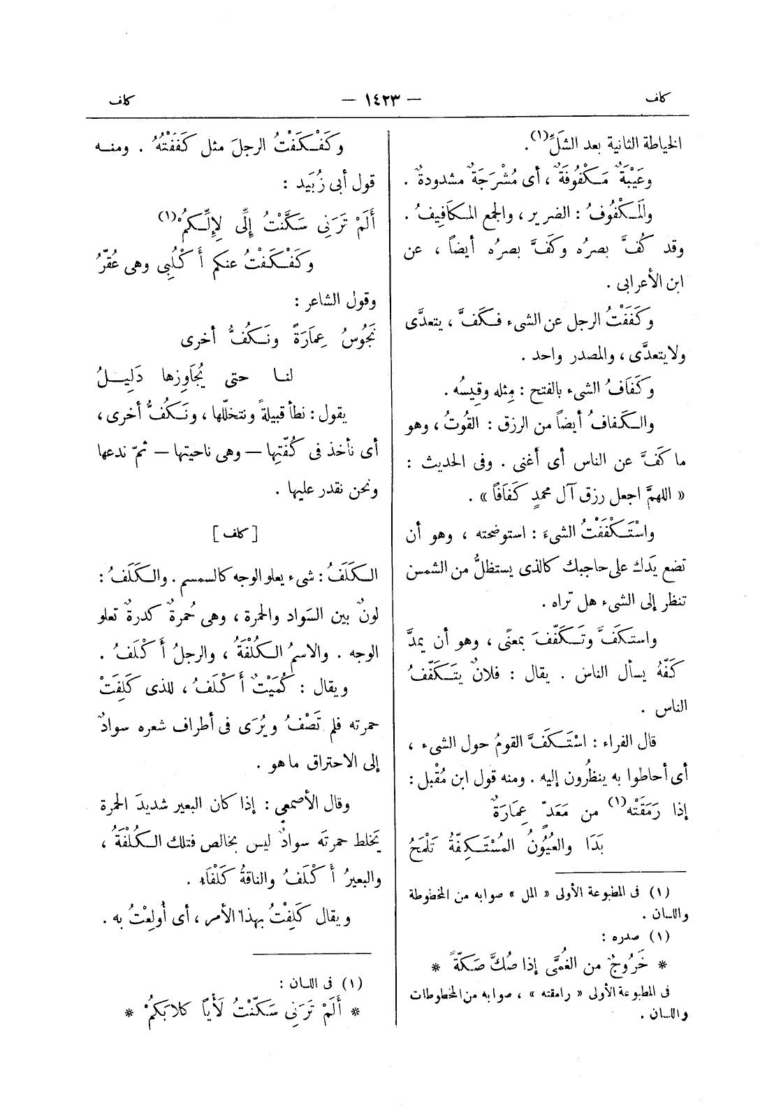 الخياطة الثانية بعد الشَلِّ (¬1) . وعَيْبَةُ مَكْفوفَةٌ، أي مُشْرَجَةً مشدودةٌ. والمَكْفوفُ: الضرير، والجمع المَكافيفُ. وقد كُفَّ بصره وكف بصره أيضا، عن ابن الاعرابي. وكففت الرجل عن الشئ فكف، يتعدى ولا يتعدَّى، والمصدر واحد. وكَفافُ الشئ بالفتح: مثله وقيسه. والكفاف أيضاً من الرزق: القوتُ، وهو ما كَفَّ عن الناس أي أغنى. وفي الحديث: " اللهمَّ اجعل رزق آل محمدٍ كفافا ". واسْتَكْفَفْتُ الشئ: استوضحته، وهو أن تضع يدك على حاجبك كالذي يستظلُّ من الشمسن تنظر إلى الشئ هل تراه. واسْتَكَفَّ وتَكَفَّفَ بمعنًى، وهو أن يمد كفه يسأل الناس. يقال: فلان يتكفف الناس. قال الفراء: استكف القوم حول الشئ، أي أحاطوا به ينظرون إليه. ومنه قول ابن مُقْبل: إذا رَمَقْته (¬1) من مَعَدٍّ عِمارَةٌ بَدا والعيون المستكفة تلمح