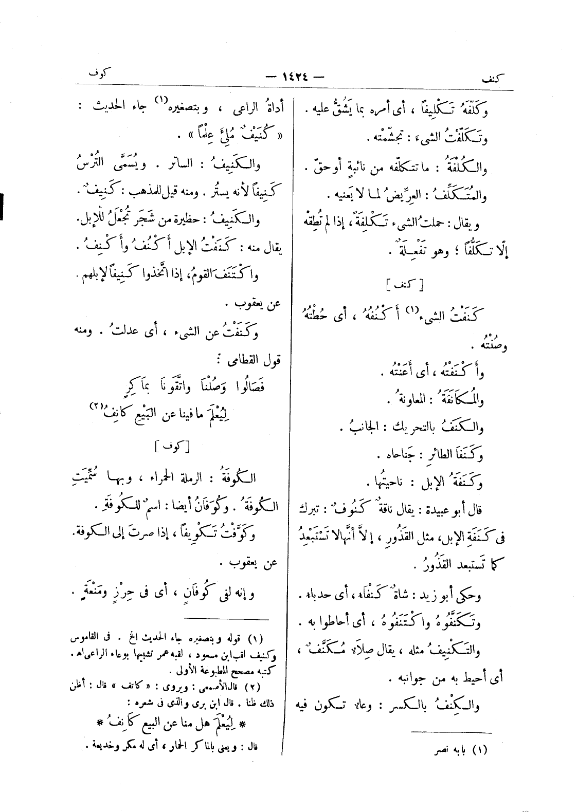أداة الراعى، وبتصغيره (¬1) جاء الحديث: " كُنَيْفٌ مُلِئَ عِلْماً ". والكَنيفُ: الساتر. ويسمى الترسُ كَنيفاً لأنه يستر. ومنه قيل للمذهب: كَنيفٌ. والكَنيفُ: حظيرة من شجر تُجعَل للإبل. يقال منه: كنفت الابل أكنف وأكنف. واكتنف القوم، إذا اتخذوا كنيفا لابلهم. عن يعقوب. وكنفت عن الشئ، أي عدلت. ومنه قول القطامي: فَصالوا وَصُلْنا واتَّقونا بما كر ليعلم ما فينا عن البيع كانف (¬2)