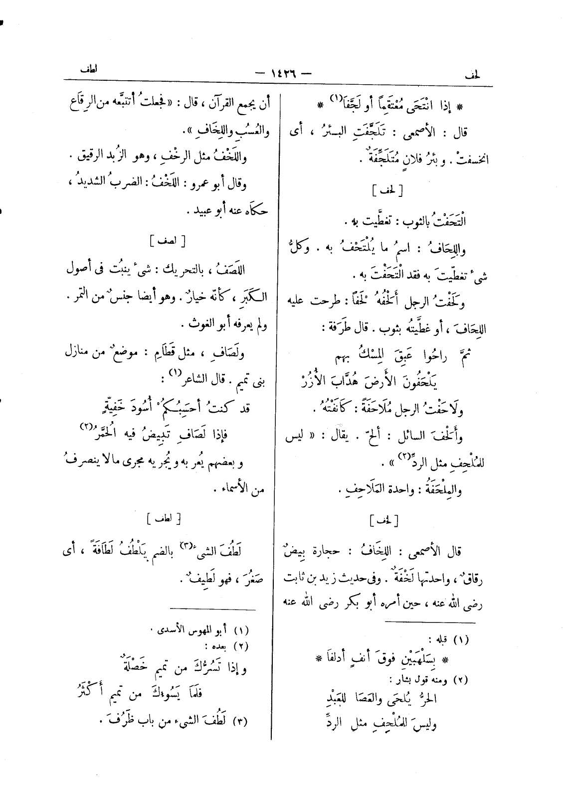 [لحف] الْتَحَفْتُ بالثوب: تغطَّيت به. واللِحافُ: اسمُ ما يُلْتَحَفُ به. وكل شئ تغطيت به فقد الْتَحَفْتَ به. ولَحَفْتُ الرجل ألْحَفُهُ لَحْفاً: طرحت عليه اللِحافَ، أو غطَّيته بثوب. قال طرفة: ثمَّ راحوا عَبِقَ المِسْكِ بهم يَلْحَفونَ الأرضَ هُدَّابَ الأُزُرْ ولاحَفْتُ الرجل ملاحفة: كانفته. وألحف السائل: ألح. يقال: " ليس للمُلْحِفِ مثل الردِّ (¬2) ". والملحفة: واحدة الملاحف.
