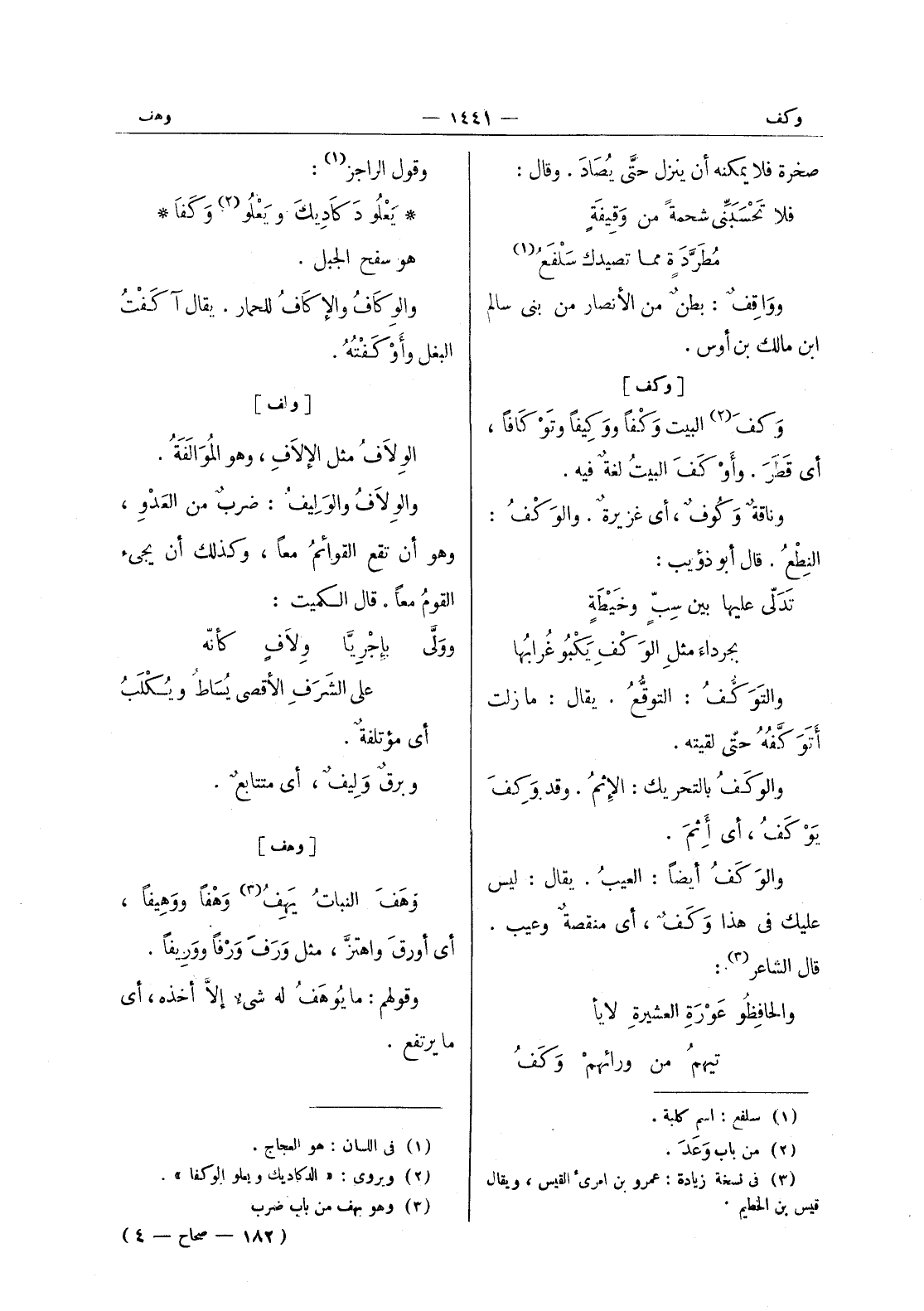 يَعْلو دَكاديكَ ويَعْلو (¬2) وَكَفا * هو سفح الجبل. والوِكافُ والإكافُ للحمار. يقال آكَفْتُ البغل وأَوْكَفْتُهُ.