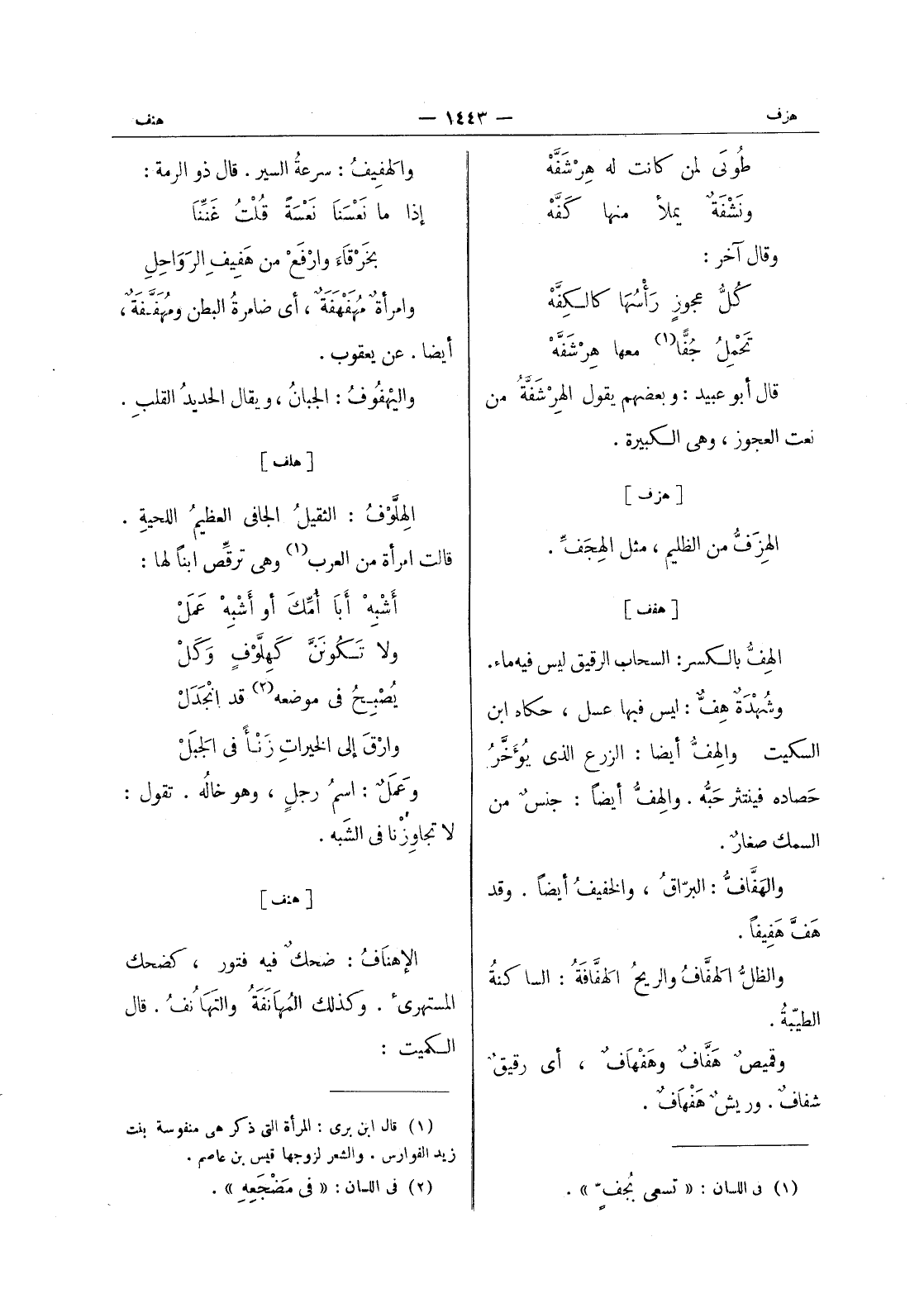 طوبى لمن كانت له هرشفه ونشفة يملا منها كفه وقال آخر: كل عجوز رأسها كالكفه تحمل جفا (¬1) معها هرشفه قال أبو عبيد: وبعضهم يقول الهِرْشَفَّةُ من نعت العجوز، وهي الكبيرة.