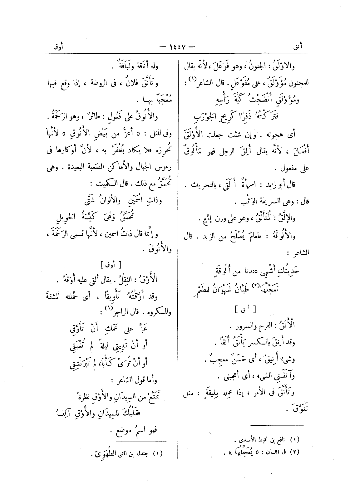 [أوق] الأَوْقُ: الثِقْلُ. يقال ألقى عليه أَوْقَهُ. وقد أَوَّقْتُهُ تَأْويقاً، أي حملته المشقة والمكروه. قال الراجز (¬1) : عز على عمك أن تأوقى أو أن تبيتى ليلة لم تغبقى أو أن ترى كأباء لم تبرنشقى وأما قول الشاعر: تمتع من السيدان والاوق نظرة فقلبك للسيدان والاوق آلف فهو اسم موضع.