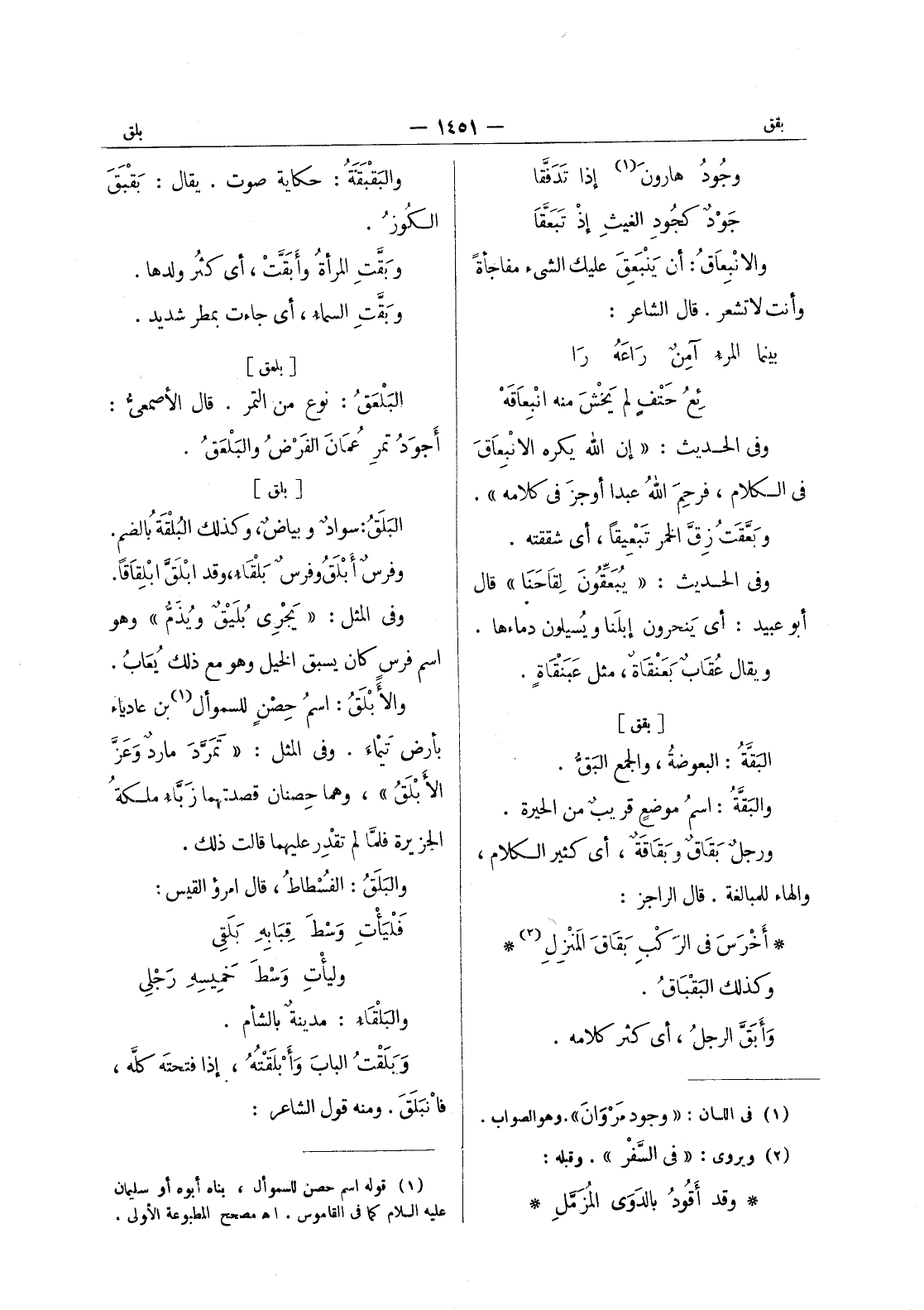 [بلق] البَلَقُ: سوادٌ وبياضٌ، وكذلك البُلْقَةُ بالضم. وفرسٌ أَبْلَقُ وفرسٌ بلقاء، وقد ابلق ابلقاقا. وفى المثل: " يجرى بليق ويذم " وهو اسم فرس كان يسبق الخيل وهو مع ذلك يعاب. والابلق: اسم حصن للسموأل (¬1) بن عادياء بأرض تيماء. وفى المثل: " تمرد مارد وعز الابلق "، وهما حصنان قصدتهما زباء ملكة الجزيرة فلما لم تقدر عليهما قالت ذلك. والبلق: الفسطاط، قال امرؤ القيس: فليأت وسط قبابه بلقى وليأت وسط خميسه رجلى والبلقاء: مدينة بالشأم. وبلقت البابَ وَأَبْلَقْتُهُ، إذا فتحتهَ كلَّه، فانبلق. ومنه قول الشاعر