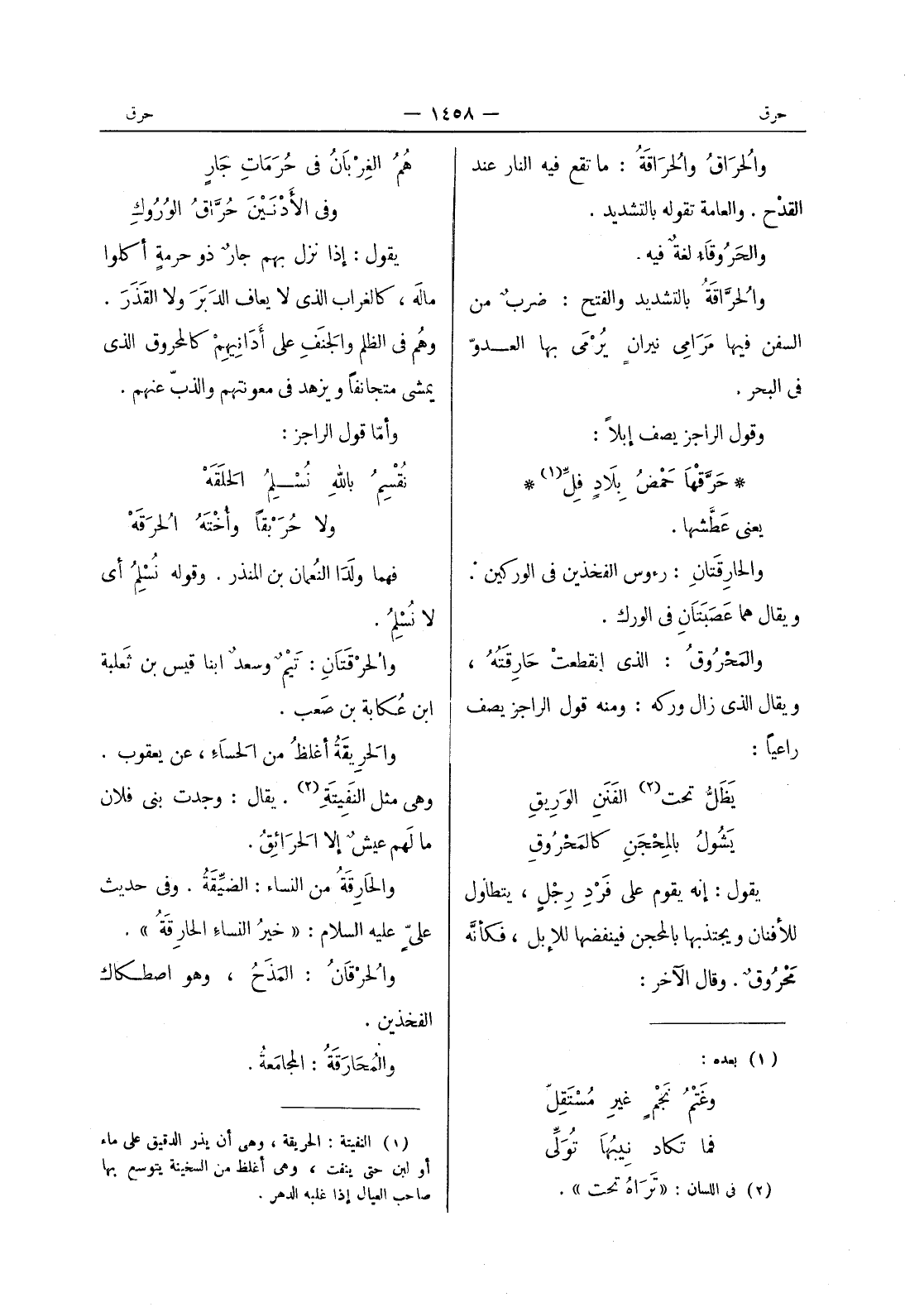 هم الغربان في حرمات جار وفى الادنين حراق الوروك يقول: إذا نزل بهم جار ذو جرمة أكلوا ما له، كالغراب الذى لا يعاف الدبر ولا القذر. وهم في الظلم والجنف على أدانيهم كالمحروق الذى يمشى متجانفا ويزهد في معونتهم والذب عنهم. وأما قول الراجز: نقسم بالله نسلم الحلقه ولا حربقا وأخته الحرقه فهما ولد النعمان بن المنذر. وقوله نسلم أي لا نسلم. والحرقتان: تيم وسعد ابنا قيس بن ثعلبة ابن عكابة بن صعب. والحريقة أغلظ من الحساء عن يعقوب. وهى مثل النفيتة (¬1) . يقال: وجدت بنى فلان ما لهم عيش إلا الحرائق. والحارقة من النساء: الضيقة. وفي حديث علي عليه السلام: " خيرُ النساء الحارِقةُ ". والحُرْقانُ: المذَحُ، وهو اصطكاك الفخذين. والمُحارَقَةُ: المجامَعةُ.