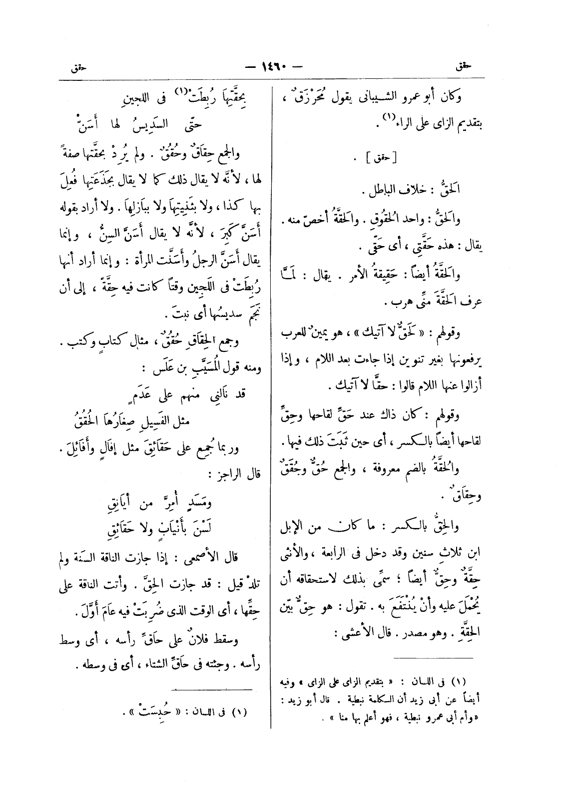بحقها ربطت (¬1) في اللجين حتى السديس لها أسن والجمع حقاق وحقق. ولم يرد بحقتها صفة لها، لانه لا يقال ذلك كما يقال بجذعتها فعل بها كذا، ولا بثنيتها ولا ببازلها. ولا أراد بقوله أسن كبر، لانه لا يقال أسن السن، وإنما يقال أسن الرجل وأسنت المرأة: وإنما أراد أنها ربطت في اللجين وقتا كانت فيه حقة، إلى أن نجم سديسها أي نبت. وجمع الحقاق حقق، مثال كتاب وكتب. ومنه قول المُسَيِّبِ بن عَلَس: قد نالني منهم على عَدَمٍ مثل الفَسيلِ صِغارُهَا الحُقُقُ وربما جُمِع على حقائق مثل إفال وأفائل. قال الراجز: ومسد أمر من أيانق لسن بأنياب ولا حقائق قال الاصمعي: إذا جازت الناقة السنة ولم تلد قيل: قد جازت الحق. وأتت الناقة على حقها، أي الوقت الذى ضربت فيه عام أول. وسقط فلان على حاقِّ رأسه، أي وسط رأسه. وجئته في حاقِّ الشتاء، أي في وسطه.